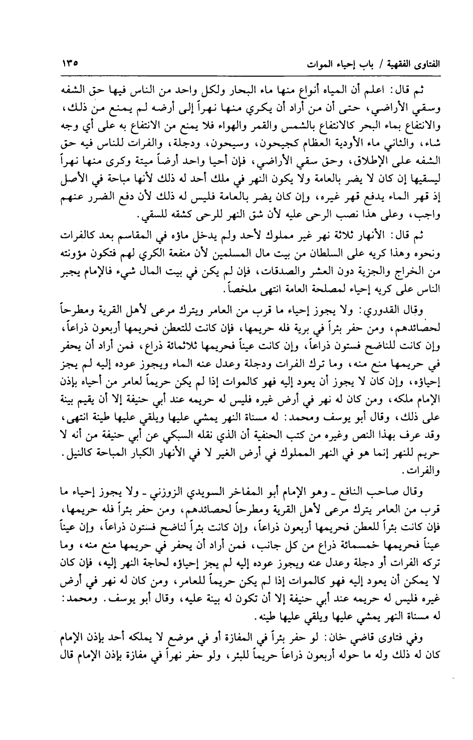 ثم قال : أعلم أن المياه أنواع منها ماء البحار ولكل واحد من الناس فيها حق الشفه وسقي الأراضي ، حتى أن من أراد أن يكري منها نهراً إلى أرضه لم يمنع من ذلك ، والانتفاع بماء البحر كالانتفاع بالشمس والقمر والهواء فلا يمنع من الانتفاع به على أي وجه شاء ، والثاني ماء الأودية العظام كجيحون ، وسيحون ، ودجلة ، والفرات للناس فيه حق الشفه على الإطلاق ، وحق سقي الأراضي ، فإن أحيا واحد أرضاً ميتة وكرى منها نهراً ليسقيها أن كان لا يضر بالعامة ولا يكون النهر في ملك أحد له ذلك لأنها مباحة في الأصل إذ قهر الماء يدفع قهر غيره ، وإن كان يضر بالعامة فليس له ذلك لأن دفع الضرر عنهم واجب ، وعلى هذا نصب الرحى عليه لأن شق النهر للرحى كشقه للسقي.