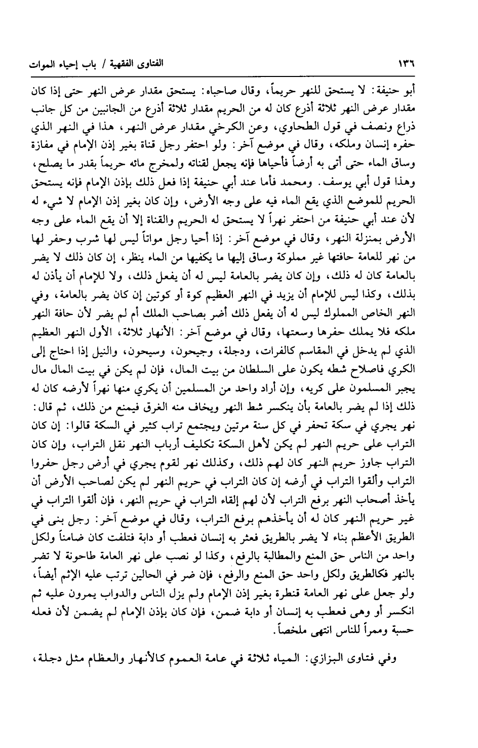 أبو حنيفة: لا يستحق للنهر حريماً، وقال صاحباه: يستحق مقدار عرض النهر حتى إذا كان مقدار عرض النهر ثلاثة أذرع كان له من الحريم مقدار ثلاثة أذرع من الجانبين من كل جانب ذراع ونصف في قول الطحاوي، وعن الكرخي مقدار عرض النهر، هذا في النهر الذي حفره إنسان وملكه، وقال في موضع آخر: ولو احتفر رجل قناة بغير إذن الإمام في مفازة وساق الماء حتى أتى به أرضاً فأحياها فإنه يجعل لقناته ولمخرج مائه حريماً بقدر ما يصلح، وهذا قول أبي يوسف. ومحمد فأما عند أبي حنيفة إذا فعل ذلك بإذن الإمام فإنه يستحق الحريم للموضع الذي يقع الماء فيه على وجه الأرض، وإن كان بغير إذن الإمام لا شيء له لأن عند أبي حنيفة من احتفر نهر ألا يستحق له الحريم والقناة إلا أن يقع الماء على وجه الأرض بمنزلة النهر، وقال في موضع آخر: إذا أحيا رجل مواتاً ليس لها شرب وحفر لها من نهر للعامة حافتها غير مملوكة وساق إليها ما يكفيها من الماء ينظر، إن كان ذلك لا يضر بالعامة كان له ذلك، وإن كان يضر بالعامة ليس له أن يفعل ذلك، ولا للإمام أن يأذن له بذلك، وكذا ليس للإمام أن يزيد في النهر العظيم كوة أو كوتين إن كان يضر بالعامة، وفي النهر الخاص المملوك ليس له أن يفعل ذلك أضر بصاحب الملك أم لم يضر لأن حافة النهر ملكه فلا يملك حفرها وسعتها، وقال في موضع آخر: الأنهار ثلاثة، الأول النهر العظيم الذي لم يدخل في المقاسم كالفرات، ودجلة، وجيحون، وسيحون، والنيل إذا احتاج إلى الكرى فاصلاح شطه يكون على السلطان من بيت المال، فإن لم يكن في بيت المال مال يجبر المسلمون على كريه، وإن أراد واحد من المسلمين أن يكري منها نهراً لأرضه كان له ذلك إذا لم يضر بالعامة بأن ينكسر شط النهر ويخاف منه الغرق فيمنع من ذلك، ثم قال: نهر يجري في سكة تحفر في كل سنة مرتين ويجتمع تراب كثير في السكة قالوا: إن كان التراب على حريم النهر لم يكن لأهل السكة تكليف أرباب النهر نقل التراب، وإن كان التراب جاوز حريم النهر كان لهم ذلك، وكذلك نهر لقوم يجري في أرض رجل حفروا التراب وألقوا التراب في أرضه إن كان التراب في حريم النهر لم يكن لصاحب الأرض أن يأخذ أصحاب النهر برفع التراب لأن لهم إلقاء التراب في حريم النهر، فإن ألقوا التراب في غير حريم النهر كان له أن يأخذهم برفع التراب، وقال في موضع آخر: رجل بنى في الطريق الأعظم بناء لا يضر بالطريق فعثر به إنسان فعطب أو دابة فتلفت كان ضامناً ولكل واحد من الناس حق المنع والمطالبة بالرفع، وكذا لو نصب على نهر العامة طاحونة لاتضر بالنهر فكالطريق ولكل واحد حق المنع والرفع، فإن ضر في الحالين ترتب عليه الإثم أيضاً، ولو جعل على نهر العامة قنطرة بغير إذن الإمام ولم يزل الناس والدواب يمرون عليه ثم انكسر أو وهى فعطب به إنسان أو دابة ضمن، فإن كان بإذن الإمام لم يضمن لأن فعله حسبة وممراً للناس انتهى ملخصاً.