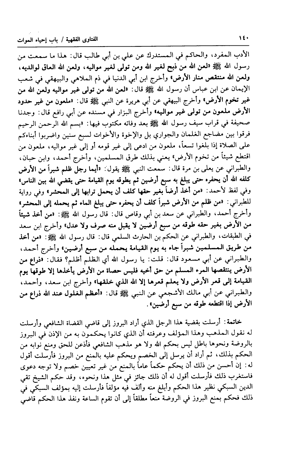 الأدب المفرد، والحاكم في المستدرك عن علي بن أبي طالب قال: هذا ما سمعت من رسول الله صلى الله عليه وسلّم (لعن الله من ذبح لغير الله ومن تولى لغير مواليه، ولعن الله العاق لوالديه، ولعن الله منتقص منار الأرض) وأخرج ابن أبي الدنيا في ذم الملاهي والبيهقي في شعب الإيمان عن ابن عباس أن رسول الله صلى الله عليه وسلّم قال: (لعن الله من تولى غير مواليه ولعن الله من غير تخوم الأرض) وأخرج البيهقي عن أبي هريرة عن النبي صلى الله عليه وسلّم قال: (ملعون من غير حدود الأرض ملعون من تولى غير مواليه) وأخرج البزار في مسنده عن أبي رافع قال: وجدنا صحيفة في قراب سيف رسول الله صلى الله عليه وسلّم بعد وفاته مكتوب فيها: (بسم الله الرحمن الرحيم فرقوا بين مضاجع الغلمان والجواري بل والإخوة والأخوات لسبع سنين واضربوا أبناءكم على الصلاة إذا بلغوا تسعاً، ملعون من ادعى إلى غير قومه أو إلى غير مواليه، ملعون من اقتطع شيئاً من تخوم الأرض) يعني بذلك طرق المسلمين، وأخرج أحمد، وابن حبان، والطبراني عن يعلى بن مرة قال: سمعت النبي صلى الله عليه وسلّم يقول: (أيما رجل ظلم شبراً من الأرض كلفه الله أن يحفره حتى يبلغ به سبع أرضين ثم يطوقه يوم القيامة حتى يقضي الله بين الناس) وفي لفظ لأحمد: (من أخذ أرضاً بغير حقها كلف أن يحمل ترابها إلى المحشر) وفي رواية للطبراني: (من ظلم من الأرض شبراً كلف أن يحفره حتى يبلغ الماء ثم يحمله إلى المحشر) وأخرج أحمد، والطبراني عن سعد بن أبي وقاص قال: قال رسول الله صلى الله عليه وسلّم: (من أخذ شيئاً من الأرض بغير حقه طوقه من سبع أرضين لا يقبل منه صرف ولا عدل) وأخرج ابن سعد في الطبقات، والطبراني عن الحكم بن الحارث السلمي قال: قال رسول الله صلى الله عليه وسلّم: (من أخذ من طريق المسلمين شبراً جاء به يوم القيامة يحمله من سبع أرضين) وأخرج أحمد، والطبراني عن أبي مسعود قال: قلت: يا رسول الله أي الظلم أظلم؟ فقال: (ذراع من الأرض ينتقصها المرء المسلم من حق أخيه فليس حصاة من الأرض يأخذها إلا طوقها يوم القيامة إلى قعر الأرض ولا يعلم قعرها إلا الله الذي خلقها) وأخرج ابن سعد، وأحمد، والطبراني عن أبي مالك الأشجعي عن النبي صلى الله عليه وسلّم قال: (أعظم الغلول عند الله ذراع من الأرض إذا اقتطعه طوقه من سبع أرضين).