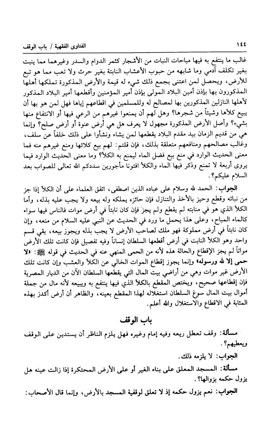الجواب: الحمد لله وسلام على عباده الذين اصطفى، اتفق العلماء على أن الكلأ إذا جز من نباته وقطع وحيز بالأخذ والتنازل فإن جائزه يملكه وله بيعه ولا يجب عليه بذله، وأما الكلأ الذي هو في منابته لم يقطع ولم يجز فإن كان نابتاً في أرض موات فالناس فيها سواء كالماء المباح، وعلى هذا يحمل ما ورد في الحديث عن النبي عليه السلام من منعه، وإن كان نابتاً في أرض مملوكة فهو ملك لصاحب الأرض لا يجب بذله ويجوز بيعه، بقي قسم واحد وهو الكلأ النابت في أرض أقطعها السلطان إنساناً وفيه تفصيل فإن كانت تلك الأرض مواتاً لم يجز الإقطاع والحالة هذه لأنه من الحمى المنهي عنه في الحديث في قوله صلى الله عليه وسلّم: (لا حمى إلا لله ورسوله) وإنما يجوز إقطاع الموات الخالي عن الكلأ والعشب وإن كانت تلك الأرض غير موات وهي من أراضي بيت المال التي يقطعها السلطان الآن من الديار المصرية فإن إقطاعها صحيح، ويختص المقطع بالكلأ الذي فيها ينتفع به ويبيعه لأنه مال من جملة أموال بيت المال سوغ السلطان استغلاله لهذا المقطع بعينه، والظاهر أن أرض أكدز بهذه المثابة في الاقطاع والاستغلال والله أعلم.