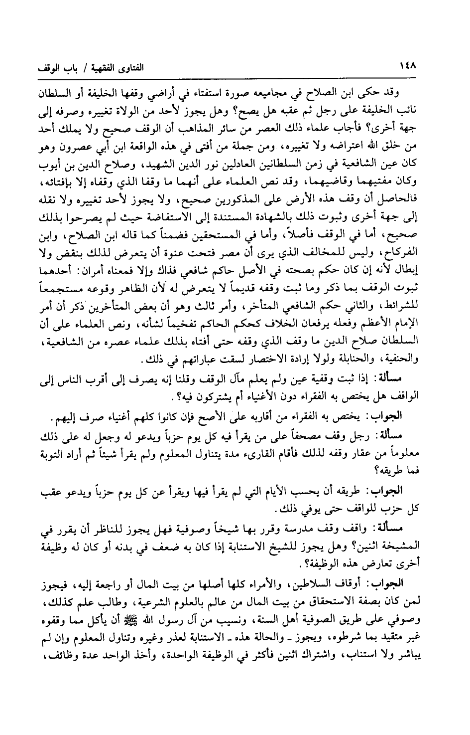 وقد حكى ابن الصلاح في مجاميعه صورة استفتاء في أراضي وقفها الخليفة أو السلطان نائب الخليفة على رجل ثم عقبه هل يصح ؟ وهل يجوز لأحد من الولاة تغييره وصرفه إلى جهة أخرى ؟ فأجاب علماء ذلك العصر من سائر المذاهب أن الوقف صحيح ولا يملك أحد من خلق الله اعتراضه ولا تغييره ، ومن جملة من أفتى في هذه الواقعة ابن أبي عصرون وهو كان عين الشافعية في زمن السلطانين العادلين نور الدين الشهيد ، وصلاح الدين بن أيوب وكان مفتيهما وقاضيهما ، وقد نص العلماء على أنهما ما وقفا الذي وقفاه إلا بإفتائه ، فالحاصل أن وقف هذه الأرض على المذكورين صحيح ، ولا يجوز لأحد تغييره ولا نقله إلى جهة أخرى وثبوت ذلك بالشهادة المستندة إلى الاستفاضة حيث لم يصرحوا بذلك صحيح ، أما في الوقف فأصلاً ، وأما في المستحقين فضمناً كما قاله ابن الصلاح ، وابن الفركاح ، وليس للمخالف الذي يرى أن مصر فتحت عنوة أن يتعرض لذلك بنقض ولا إبطال لأنه إن كان حكم بصحته في الأصل حاكم شافعي فذاك وإلا فمعناه أمران : أحدهما ثبوت الوقف بما ذكر وما ثبت وقفه قديماً لا يتعرض له لأن الظاهر وقوعه مستجمعاً للشرائط ، والثاني حكم الشافعي المتأخر ، وأمر ثالث وهو أن بعض المتأخرين ذكر أن أمر الإمام الأعظم وفعله يرفعان الخلاف كحكم الحاكم تفخيماً لشأنه ، ونص العلماء على أن السلطان صلاح الدين ما وقف الذي وقفه حتى أفتاه بذلك علماء عصره من الشافعية ، والحنفية ، والحنابلة ولولا إرادة الاختصار لسقت عباراتهم في ذلك.