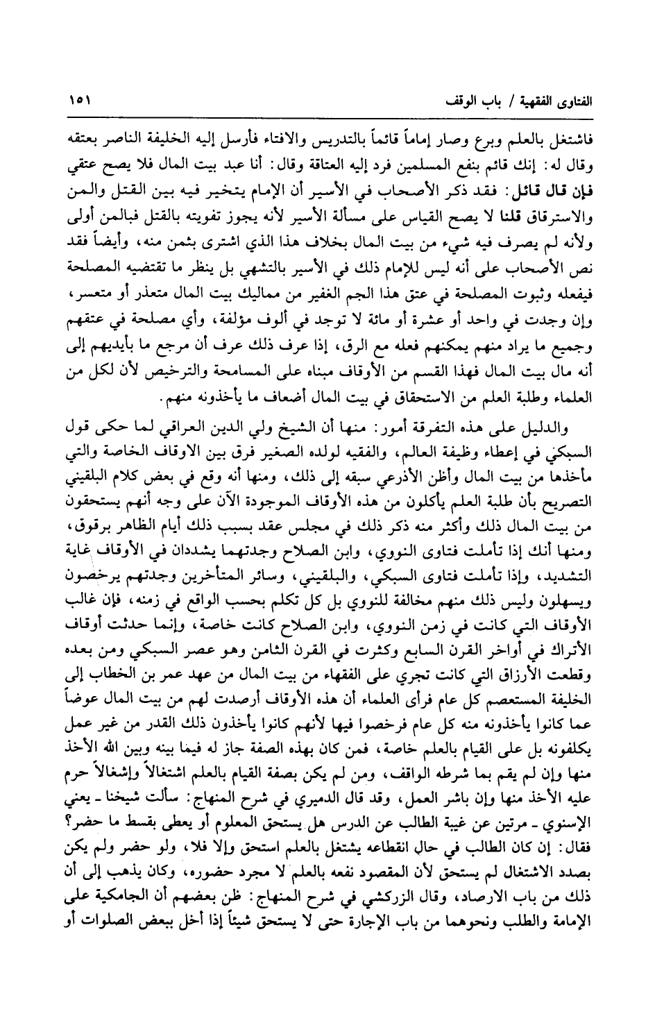 فاشتغل بالعلم وبرع وصار إماماً قائماً بالتدريس والافتاء فأرسل إليه الخليفة الناصر بعتقه وقال له: إنك قائم بنفع المسلمين فرد إليه العتاقة وقال: أنا عبد بيت المال فلا يصح عتقي فإن قال قائل: فقد ذكر الأصحاب في الأسير أن الإمام يتخير فيه بين القتل والمن والإسترقاق قلنا لا يصح القياس على مسألة الأسير لأنه يجوز تفويته بالقتل فبالمن أولى ولأنه لم يصرف فيه شيء من بيت المال بخلاف هذا الذي اشترى بثمن منه، وأيضاً فقد نص الأصحاب على أنه ليس للإمام ذلك في الأسير بالتشهي بل ينظر ما تقتضيه المصلحة فيفعله وثبوت المصلحة في عتق هذا الجم الغفير من مماليك بيت المال متعذر أو متعسر، وإن وجدت في واحد أو عشرة أو مائة لا توجد في ألوف مؤلفة، وأي مصلحة في عتقهم وجميع ما يراد منهم يمكنهم فعله مع الرق، إذا عرف ذلك عرف أن مرجع ما بأيديهم إلى أنه مال بيت المال فهذا القسم من الأوقاف مبناه على المسامحة والترخيص لأن لكل من العلماء وطلبة العلم من الاستحقاق في بيت المال أضعاف ما يأخذونه منهم.