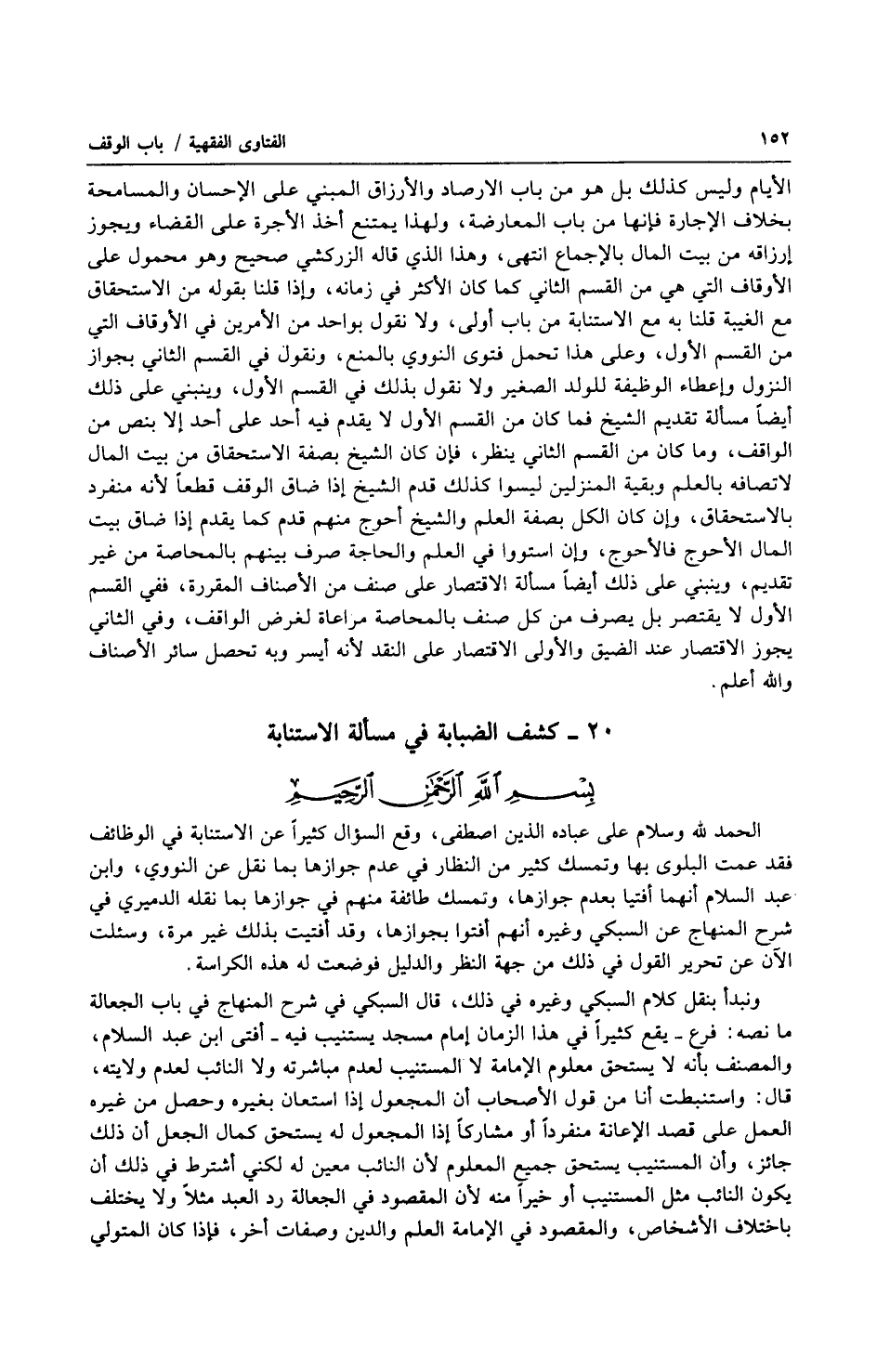 الحمد لله وسلام على عباده الذين اصطفى، وقع السؤال كثيراً عن الاستنابة في الوظائف فقد عمت البلوى بها وتمسك كثير من النظار في عدم جوازها بما نقل عن النووي، وابن عبد السلام أنهما أفتيا بعدم جوازها، وتمسك طائفة منهم في جوازها بما نقله الدميري في شرح المنهاج عن السبكي وغيره أنهم أفتوا بجوازها، وقد أفتيت بذلك غير مرة، وسئلت الآن عن تحرير القول في ذلك من جهة النظر والدليل فوضعت له هذه الكراسة.