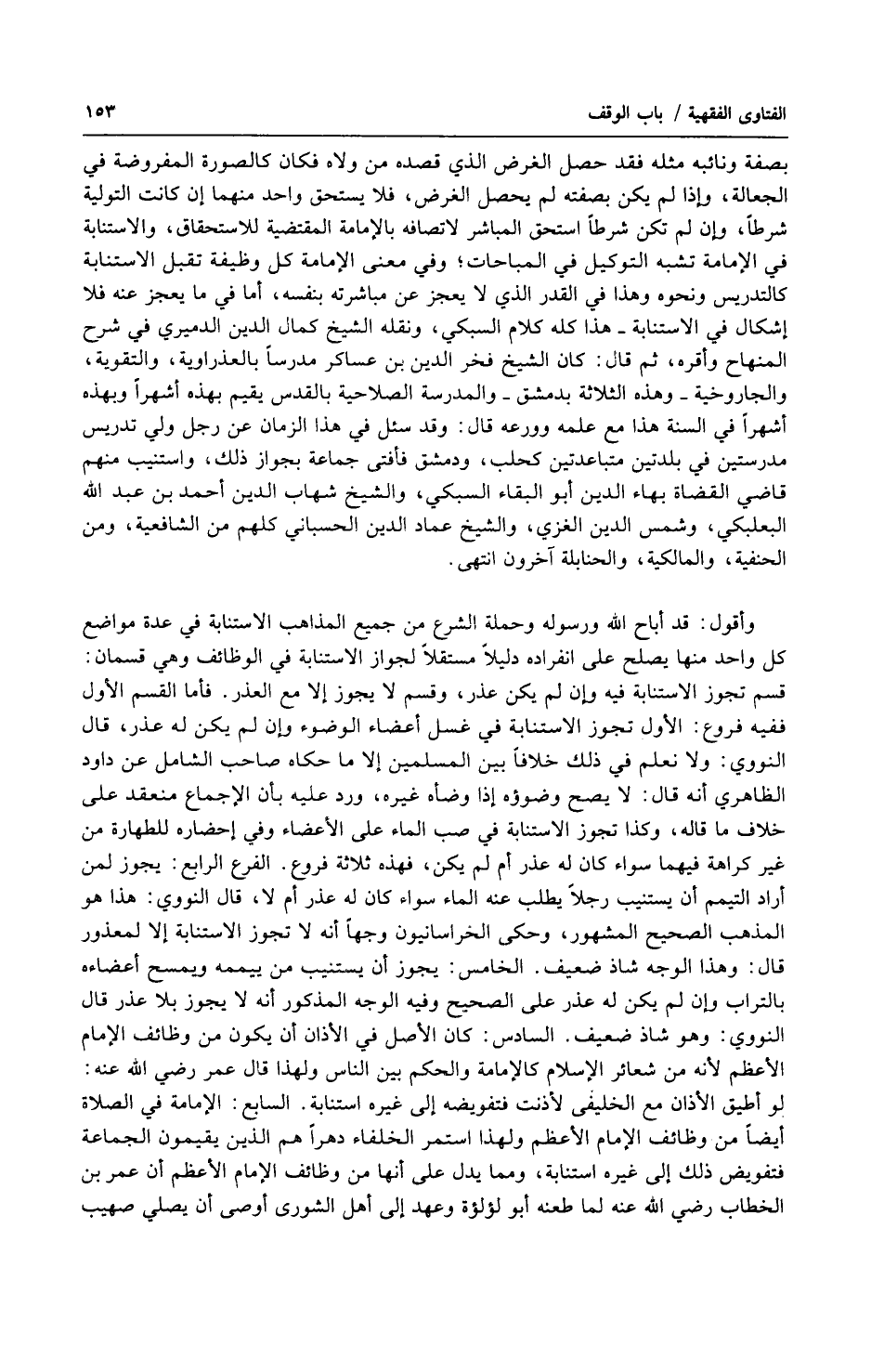 وأقول : قد أباح الله ورسوله وحملة الشرع من جميع المذاهب الاستنابة في عدة مواضع كل واحد منها يصلح على انفراده دليلاً مستقلاً لجواز الاستنابة في الوظائف وهي قسمان : قسم تجوز الاستنابة فيه وأن لم يكن عذر ، وقسم لا يجوز إلا مع العذر. فأما القسم الأول ففيه فروع : الأول تجوز الاستنابة في غسل أعضاء الوضوء وإن لم يكن له عذر ، قال النووي : ولا نعلم في ذلك خلافاً بين المسلمين إلا ما حكاه صاحب الشامل عن داود الظاهري أنه قال : لا يصح وضوؤه إذا وضأه غيره ، ورد عليه بأن الإجماع منعقد على خلاف ما قاله ، وكذا تجوز الاستنابة في صب الماء على الأعضاء وفي إحضاره للطهارة من غير كراهة فيهما سواء كان له عذر أم لم يكن ، فهذه ثلاثة فروع. الفرع الرابع : يجوز لمن أراد التيمم أن يستنيب رجلاً يطلب عنه الماء سواء كان له عذر أم لا ، قال النووي : هذا هو المذهب الصحيح المشهور ، وحكى الخراسانيون وجهاً أنه لا تجوز الاستنابة إلا لمعذور قال : وهذا الوجه شاذ ضعيف. الخامس : يجوز أن يستنيب من ييممه ويمسح أعضاءه بالتراب وإن لم يكن له عذر على الصحيح وفيه الوجه المذكور أنه لا يجوز بلا عذر قال النووي : وهو شاذ ضعيف. السادس : كان الأصل في الأذان أن يكون من وظائف الإمام الأعظم لأنه من شعائر الإسلام كالإمامة والحكم بين الناس ولهذا قال عمر رضي الله عنه : لو أطيق الأذان مع الخليفى لأذنت فتفويضه إلى غيره استنابة. السابع : الإمامة في الصلاة أيضاً من وظائف الإمام الأعظم ولهذا استمر الخلفاء دهراً هم الذين يقيمون الجماعة فتفويض ذلك إلى غيره استنابة ، ومما يدل على أنها من وظائف الإمام الأعظم أن عمر بن الخطاب رضي الله عنه لما طعنه أبو لؤلؤة وعهد إلى أهل الشورى أوصى أن يصلي صهيب