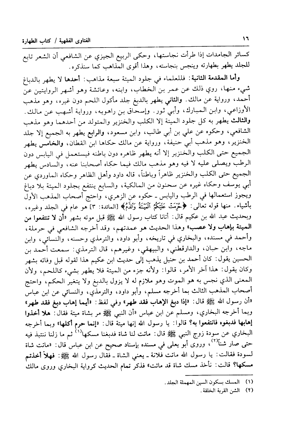وأما المقدمة الثانية : فللعلماء في جلود الميتة سبعة مذاهب : أحدها لا يطهر بالدباغ شيء منها ، روى ذلك عن عمر بن الخطاب ، وابنه ، وعائشة وهو أشهر الروايتين عن أحمد ، ورواية عن مالك. والثاني يطهر بالدبغ جلد مأكول اللحم دون غيره ، وهو مذهب الأوزاعي ، وابن المبارك ، وأبي ثور. وأسحق بن راهوية ، ورواية أشهب عن مالك. والثالث يطهر به كل جلود الميتة إلا الكلب والخنزير والمتولد من أحدهما وهو مذهب الشافعي ، وحكوه عن علي بن أبي طالب ، وابن مسعود ، والرابع يطهر به الجميع إلا جلد الخنزير ، وهو مذهب أبي حنيفة ، ورواية عن مالك حكاها ابن القطان ، والخامس يطهر الجميع حتى الكلب والخنزير إلا أنه يطهر ظاهره دون باطنه فيستعمل في اليابس دون الرطب ويصلي عليه لا فيه وهو مذهب مالك فيما حكاه أصحابنا عنه ، والسادس يطهر الجميع حتى الكلب والخنزير ظاهراً وباطناً ، قاله داود وأهل الظاهر وحكاه الماوردي عن أبي يوسف وحكاه غيره عن سحنون من المالكية ، والسابع ينتفع بجلود الميتة بلا دباغ ويجوز استعمالها في الرطب واليابس حكوه عن الزهري ، واحتج أصحاب المذهب الأول بأشياء. منها قوله تعالى : ) حرمت عليكم الميتة والدم ( هو عام في الجلد وغيره ، وبحديث عبد الله ابن عكيم قال : أتانا كتاب رسول الله صلى الله عليه وسلّم قبل موته بشهر ( أن لا تنتفعوا من الميتة بإهاب ولا عصب ) وهذا الحديث هو عمدتهم ، وقد أخرجه الشافعي في حرملة ، وأحمد في مسنده ، والبخاري في تاريخه ، وأبو داود ، والترمذي وحسنه ، والنسائي ، وابن ماجه ، وابن حبان ، والدارقطنى ، والبيهقي ، وغيرهم ، قال الترمذي : سمعت أحمد بن الحسين يقول : كان أحمد بن حنبل يذهب إلى حديث ابن عكيم هذا لقوله قبل وفاته بشهر وكان يقول : هذا آخر الأمر ، قالوا : ولأنه جزء من الميتة فلا يطهر بشيء كاللحم ، ولأن المعنى الذي نجس به هو الموت وهو ملازم له لا يزول بالدبغ ولا يتغير الحكم ، واحتج أصحاب المذهب الثالث بما أخرجه مسلم ، وأبو داود ، والترمذي ، والنسائي عن ابن عباس ( أن رسول الله صلى الله عليه وسلّم قال : ( إذا دبغ الإهاب فقد طهر ) وفي لفظ : ( أيما إهاب دبغ فقد طهر ) وبما أخرجه البخاري ، ومسلم عن ابن عباس ( أن النبي صلى الله عليه وسلّم مر بشاة ميتة فقال : هلا أخذوا إهابها فدبغوه فانتفعوا به ؟ قالوا : يا رسول الله إنها ميتة قال : ( إنما حرم أكلها ) وبما أخرجه البخاري عن سودة زوج النبي صلى الله عليه وسلّم قال : ماتت لنا شاة فدبغنا مسكها ثم ما زلنا ننتبذ فيه حتى صار شناً ، روى أبو يعلى في مسنده بإسناد صحيح عن ابن عباس قال : ( ماتت شاة لسودة فقالت : يا رسول الله ماتت فلانة يعني الشاة فقال رسول الله صلى الله عليه وسلّم : فهلاّ أخذتم مسكها ؟ قالت : نأخذ مسك شاة قد ماتت ) فذكر تمام الحديث كرواية البخاري وروي مالك