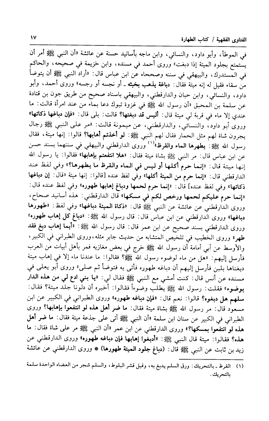 في الموطأ ، وأبو داود ، والنسائي ، وابن ماجه بأسانيد حسنة عن عائشة ( أن النبي صلى الله عليه وسلّم أمر أن يستمتع بجلود الميتة إذا دبغت ) وروى أحمد في مسنده ، وابن خزيمة في صحيحه ، والحاكم في المستدرك ، والبيهقي في سننه وصححاه عن ابن عباس قال : ( أراد النبي صلى الله عليه وسلّم أن يتوضأ من سقاء فقيل له إنه ميتة فقال : دباغة يذهب بخبثه أو نجسه أو رجسه ) وروى أحمد ، وأبو داود ، والنسائي ، وابن حبان والدارقطنى ، والبيهقي باسناد صحيح من طريق جون بن قتادة عن سلمة بن المحبق ( أن رسول الله صلى الله عليه وسلّم في غزوة تبوك دعا بماء من عند امرأة قالت : ما عندي إلا ماء في قربة لي ميتة قال : أليس قد دبغتها ؟ قالت : بلى قال : ( فإن دباغها ذكاتها ) وروى أبو داود ، والنسائي ، والدارقطنى ، عن ميمونة قالت : ( مر على النبي صلى الله عليه وسلّم رجال يجرون شاة لهم مثل الحمار فقال لهم النبي صلى الله عليه وسلّم : لو أخذتم أهابها ؟ قالوا : إنها ميتة ، فقال رسول الله صلى الله عليه وسلّم : يطهرها الماء والقرظ ) وروى الدارقطنى والبيهقي في سننهما بسند حسن عن ابن عباس قال : مر النبي صلى الله عليه وسلّم بشاة ميتة فقال : ( هلا انتفعتم بأهابها ) فقالوا : يا رسول الله إنها ميتة قال : ( إنما حرم أكلها أو ليس في الماء والقرظ ما يطهرها ؟ ) وفي لفظ عند الدارقطني قال : ( إنما حرم من الميتة أكلها ) وفي لفظ عنده [ قالوا : إنها ميتة ( قال : دباغها ذكاتها ) وفي لفظ عنده ] ( 2 قال : ( إنما حرم لحمها ودباغ إهابها طهوره ) وفي لفظ عنده قال : ( إنما حرم عليكم لحمها ورخص لكم في مسكها ) قال الدارقطنى : هذه أسانيد صحاح ، وروى الدارقطنى عن عائشة عن النبي صلى الله عليه وسلّم قال : ( ذكاة الميتة دباغها ) وفي لفظ : ( طهورها دباغها ) وروى الدارقطنى عن ابن عباس قال : قال رسول الله صلى الله عليه وسلّم : ( دباغ كل إهاب طهوره ) وروى الدارقطنى بسند صحيح عن ابن عمر قال : قال رسول الله صلى الله عليه وسلّم : ( أيما اهاب دبغ فقد طهر ) وروى الخطيب في تلخيص المتشابه من حديث جابر مثله ، وروى الطبراني في الكبير ، والأوسط عن أبي أمامة أن رسول الله صلى الله عليه وسلّم خرج في بعض مغازيه فمر بأهل أبيات من العرب فأرسل إليهم : ( هل من ماء لوضوء رسول الله صلى الله عليه وسلّم ؟ فقالوا : ما عندنا ماء إلا في إهاب ميتة دبغناها بلبن فأرسل إليهم أن دباغه طهوره فأتى به فتوضأ ثم صلى ) وروى أبو يعلى في مسنده عن أنس قال : كنت أمشي مع النبي صلى الله عليه وسلّم فقال لي : يا بني ادع لي من هذه الدار بوضوء فقلت : رسول الله صلى الله عليه وسلّم يطلب وضوءاً فقالوا : أخبره أن دلونا جلد ميتة ؟ فقال : سلهم هل دبغوه ؟ قالوا : نعم قال : ( فإن دباغه طهوره ) وروى الطبراني في الكبير عن ابن مسعود قال : مر رسول الله صلى الله عليه وسلّم بشاة ميتة فقال : ما ضر أهل هذه لو انتفعوا بأهابها ؟ وروى الطبراني في الكبير عن سنان ابن سلمة ( أن النبي صلى الله عليه وسلّم أتى على جذعة ميتة فقال : ما ضر أهل هذه لو انتفعوا بمسكها ؟ ) وروى الدارقطنى عن ابن عمر ( أن النبي صلى الله عليه وسلّم مر على شاة فقال : ما هذه ؟ فقالوا : ميتة قال النبي صلى الله عليه وسلّم : ( أدبغوا إهابها فإن دباغه طهوره ) وروى الدارقطنى عن زيد بن ثابت عن النبي صلى الله عليه وسلّم قال : ( دباغ جلود الميتة طهورها ) وروى الدارقطنى عن عائشة