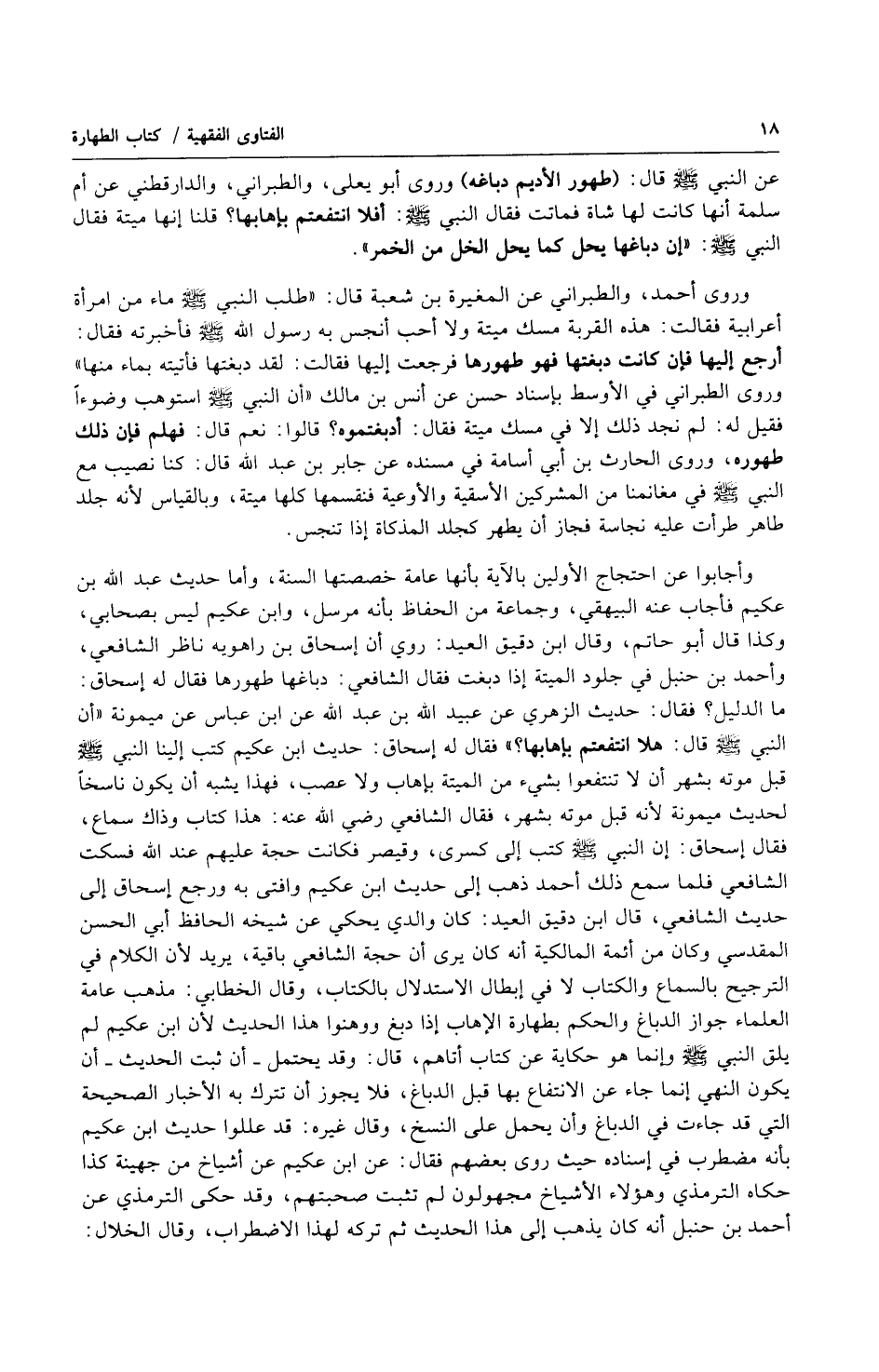 وأجابوا عن احتجاج الأولين بالآية بأنها عامة خصصتها السنة ، وأما حديث عبد الله بن عكيم فأجاب عنه البيهقي ، وجماعة من الحفاظ بأنه مرسل ، وابن عكيم ليس بصحابي ، وكذا قال أبو حاتم ، وقال ابن دقيق العيد : روى أن إسحاق بن راهويه ناظر الشافعي ، وأحمد بن حنبل في جلود الميتة إذا دبغت فقال الشافعي : دباغها طهورها فقال له إسحاق : ما الدليل ؟ فقال : حديث الزهري عن عبيد الله بن عبد الله عن ابن عباس عن ميمونة ( أن النبي صلى الله عليه وسلّم قال : هلا انتفعتم بإهابها ؟ ) فقال له إسحاق : حديث ابن عكيم كتب إلينا النبي صلى الله عليه وسلّم قبل موته بشهر أن لا تنتفعوا بشيء من الميتة بإهاب ولا عصب ، فهذا يشبه أن يكون ناسخاً لحديث ميمونة لأنه قبل موته بشهر ، فقال الشافعي رضي الله عنه : هذا كتاب وذاك سماع ، فقال إسحاق : أن النبي صلى الله عليه وسلّم كتب إلى كسرى ، وقيصر فكانت حجة عليهم عند الله فسكت الشافعي فلما سمع ذلك أحمد ذهب إلى حديث ابن عكيم وافتى به ورجع إسحاق إلى حديث الشافعي ، قال ابن دقيق العيد : كان والدي يحكي عن شيخه الحافظ أبي الحسن المقدسي وكان من أئمة المالكية أنه كان يرى أن حجة الشافعي باقية ، يريد لأن الكلام في الترجيح بالسماع والكتاب لا في إبطال الاستدلال بالكتاب ، وقال الخطابي : مذهب عامة العلماء جواز الدباغ والحكم بطهارة الإهاب إذا دبغ ووهنوا هذا الحديث لأن ابن عكيم لم يلق النبي صلى الله عليه وسلّم وإنما هو حكاية عن كتاب أتاهم ، قال : وقد يحتمل أن ثبت الحديث أن يكون النهي إنما جاء عن الانتفاع بها قبل الدباغ ، فلا يجوز أن تترك به الأخبار الصحيحة التي قد جاءت في الدباغ وأن يحمل على النسخ ، وقال غيره : قد عللوا حديث ابن عكيم بأنه مضطرب في إسناده حيث روى بعضهم فقال : عن ابن عكيم عن أشياخ من جهينة كذا حكاه الترمذي وهؤلاء الأشياخ مجهولون لم تثبت صحبتهم ، وقد حكى الترمذي عن أحمد بن حنبل أنه كان يذهب إلى هذا الحديث ثم تركه لهذا الاضطراب ، وقال الخلال :