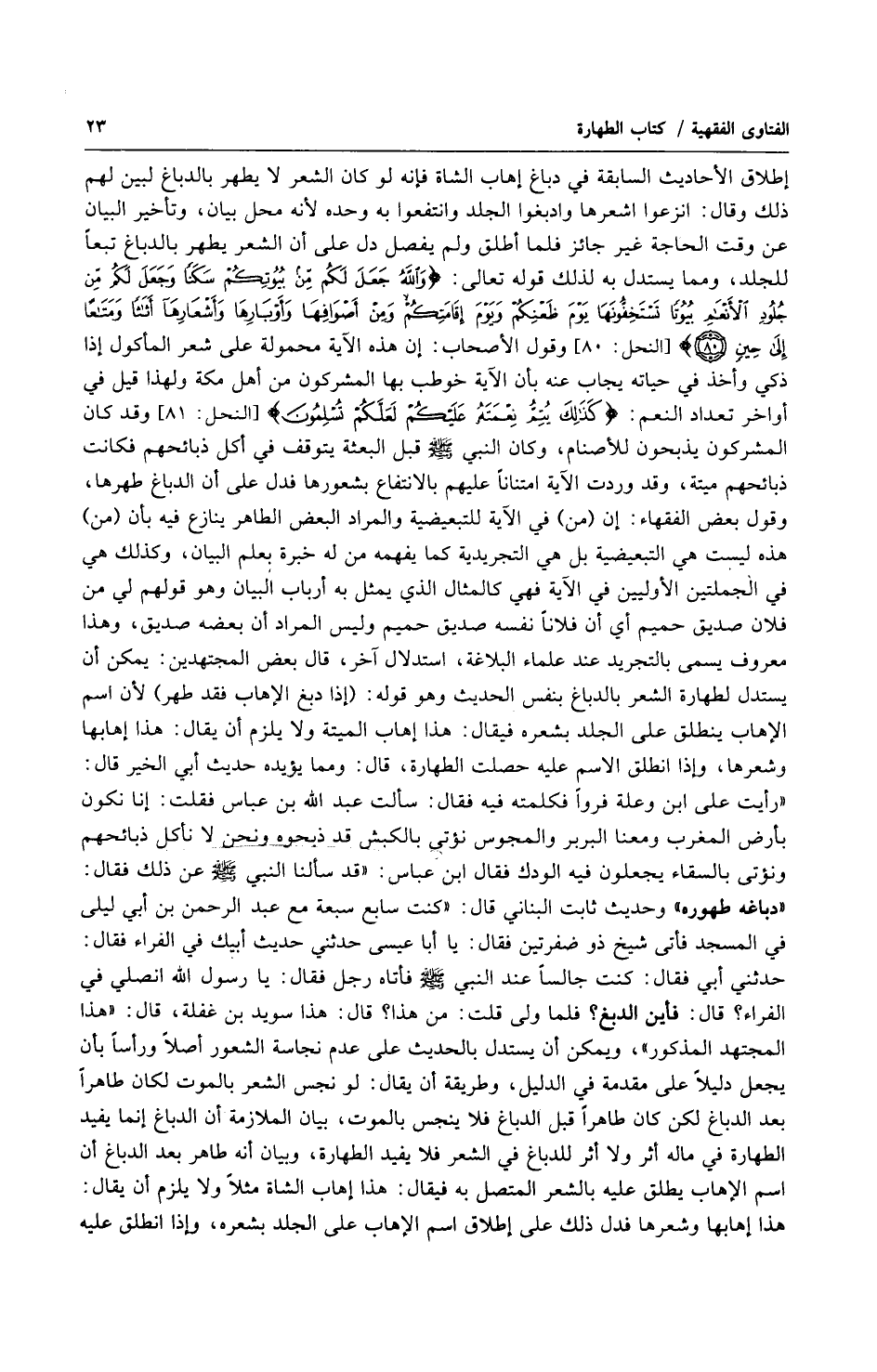 إطلاق الأحاديث السابقة في دباغ إهاب الشاة فإنه لو كان الشعر لا يطهر بالدباغ لبين لهم ذلك وقال: انزعوا اشعرها وادبغوا الجلد وانتفعوا به وحده لأنه محل بيان، وتأخير البيان عن وقت الحاجة غير جائز فلما أطلق ولم يفصل دل على أن الشعر يطهر بالدباغ تبعاً للجلد، ومما يستدل به لذلك قوله تعالى:) والله جعل لكم من بيوتكم سكناً وجعل لكم من جلود الأنعام بيوتاً تستخفونها يوم ظعنكم ويوم إقامتكم ومن أصوافها وأوبارها وأشعارها أثاثاً ومتاعاً إلى حين (وقول الأصحاب: إن هذه الآية محمولة على شعر المأكول إذا ذكي وأخذ في حياته يجاب عنه بأن الآية خوطب بها المشركون من أهل مكة ولهذا قيل في أواخر تعداد النعم:) كذلك يتم نعمته عليكم لعلكم تسلمون (وقد كان المشركون يذبحون للأصنام، وكان النبي صلى الله عليه وسلّم قبل البعثة يتوقف في أكل ذبائحهم فكانت ذبائحهم ميتة، وقد وردت الآية امتناناً عليهم بالانتفاع بشعورها فدل على أن الدباغ طهرها، وقول بعض الفقهاء: إن (من) في الآية للتبعيض والمراد البعض الطاهر ينازع فيه بأن (من) هذه ليست هي التبعيضة بل هي التجريدية كما يفهمه من له خبرة بعلم البيان، وكذلك هي في الجملتين الأوليين في الآية فهي كالمثال الذي يمثل يه أرباب البيان وهو قولهم لي مني فلان صديق حميم أي أن فلاناً نفسه صديق حميم وليس المراد أن بعضه صديق، وهذا معروف يسمى بالتجريد عند علماء البلاغة، استدلال آخر، قال بعض المجتهدين: يمكن أن يستدل لطهارة الشعر بالدباغ بنفس الحديث وهو قوله: (إذا دبغ الإهاب فقد طهر) لأن اسم الإهاب ينطلق على الجلد بشعره فيقال: هذا إهاب الميتة ولا يلزم أن يقال: هذا إهابها وشعرها، وإذا انطلق الإسم عليه حصلت الطهارة، قال: ومما يؤيده حديث أبي الخير قال: (رأيت على ابن وعلة فرواً فكلمته فيه فقال: سألت عبد الله بن عباس فقلت: انا نكون بأرض المغرب ومعنا البربر والمجوس نؤتي بالكبش قد ذبحوه ونحن لا نأكل ذبائحهم ونؤتي بالسقاء يجعلون فيه الودك فقال ابن عباس: (قد سألنا النبي صلى الله عليه وسلّم عن ذلك فقال: (دباغه طهوره) وحديث ثابت البناني قال: (كنت سابع سبعة مع عبد الرحمن بن أبي ليلى في المسجد فأتى شيخ ذو ضفرتين فقال: يا أبا عيسى حدثني حديث أبيك في الفراء فقال: حدثني أبي فقال: كنت جالساً عند النبي صلى الله عليه وسلّم فأتاه رجل فقال: يا رسول الله انصلي في الفراء؟ قال: فأين الدبغ؟ فلما ولى قلت: من هذا؟ قال: هذا سويد بن غفلة، قال: (هذا المجتهد المذكور)، ويمكن أن يستدل بالحديث على عدم نجاسة الشعور أصلاً ورأساً بأن يجعل دليلاً على مقدمة في الدليل، وطريقة أن يقال: لو نجس الشعر بالموت لكان طاهراً بعد الدباغ لكن كان طاهراً قبل الدباغ فلا ينجس بالموت، بيان الملازمة أن الدباغ إنما يفيد الطهارة في ماله أثر ولا أثر للدباغ في الشعر فلا يفيد الطهارة، وبيان أنه طاهر بعد الدباغ أن اسم الإهاب يطلق عليه بالشعر المتصل به فيقال: هذا إهاب الشاة مثلاً ولا يلزم أن يقال: هذا إهابها وشعرها فدل ذلك على إطلاق اسم الإهاب على الجلد بشعره، وإذا انطلق عليه