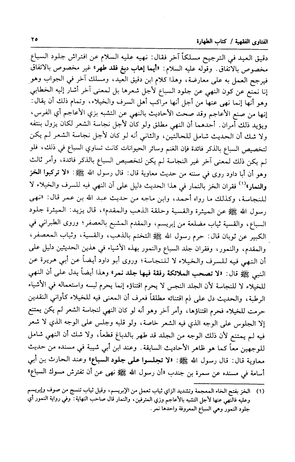 دقيق العيد في الترجيح مسلكاً آخر فقال : نهيه عليه السلام عن افتراش جلود السباع مخصوص بالاتفاق. وقوله عليه السلام : ( أيما إهاب دبغ فقد طهر ) غير مخصوص بالاتفاق فيرجح العمل به على معارضة ، وهذا كلام ابن دقيق العيد ، ومسلك آخر في الجواب وهو انا نمنع عن كون النهي عن جلود السباع لأجل شعرها بل لمعنى آخر أشار إليه الخطابي وهو أنها إنما نهى عنها من أجل أنها مراكب أهل السرف والخيلاء ، وتمام ذلك أن يقال : إنها من صنع الأعاجم وقد صحت الأحاديث بالنهي عن التشبه بزي الأعاجم أي الفرس ، ويؤيد ذلك أمران. أحدهما أن النهي مطلق ولو كان لأجل نجاسة الشعر لكان يزول بنتفه ولا شك أن الحديث شامل للحالتين ، والثاني أنه لو كان لأجل نجاسة الشعر لم يكن لتخصيص السباع بالذكر فائدة فإن الغنم وسائر الحيوانات كانت تساوي السباع في ذلك ، فلو لم يكن ذلك لمعنى آخر غير النجاسة لم يكن لتخصيص السباع بالذكر فائدة ، وأمر ثالث وهو أن أبا داود روى في سننه من حديث معاوية قال : قال رسول الله صلى الله عليه وسلّم : ( لا تركبوا الخز والنمار ) فقرأ الخز بالنمار في هذا الحديث دليل على أن النهي فيه للسرف والخيلاء لا للنجاسة ، وكذلك ما رواه أحمد ، وابن ماجه من حديث عبد الله بن عمر قال : ( نهى رسول الله صلى الله عليه وسلّم عن الميثرة والقسية وحلقة الذهب والمقدم ) ، قال يزيد : الميثرة جلود السباع ، والقسية ثياب مضلعة من إبريسم ، والمقدم المشبع بالعصفر ؛ وروى الطبراني في الكبير عن ثوبان قال : حرم رسول الله صلى الله عليه وسلّم التختم بالذهب ، والقسية ، وثياب المعصفر ، والمقدم ، والنمور ، وفقر أن جلد السباع والنمور بهذه الأشياء في هذين الحديثين دليل على أن النهي فيه للسرف والخيلاء لا للنجاسة ؛ وروى أبو داود أيضاً عن أبي هريرة عن النبي صلى الله عليه وسلّم قال : ( لا تصحب الملائكة رفقة فيها جلد نمر ) وهذا أيضاً يدل على أن النهي للخيلاء لا للنجاسة لأن الجلد النجس لا يحرم اقتناؤه إنما يحرم لبسه وأستعماله في الأشياء الرطبة ، والحديث دل على ذم اقتنائه مطلقاً فعرف أن المعنى فيه للخيلاء كأواني النقدين حرمت للخيلاء فحرم اقتناؤها ، وأمر آخر وهو أنه لو كان النهي لنجاسة الشعر لم يكن يمتنع إلا الجلوس على الوجه الذي فيه الشعر خاصة ، ولو قلبه وجلس على الوجه الذي لا شعر فيه لم يمتنع لأن ذلك الوجه من الجلد قد طهر بالدباغ قطعاً ، ولا شك أن النهي شامل للوجهين معاً كما هو ظاهر الأحاديث السابقة. وعند ابن أبي شيبة في مسنده من حديث معاوية قال : قال رسول الله صلى الله عليه وسلّم : ( لا تجلسوا على جلود السباع ) وعند الحارث بن أبي أسامة في مسنده عن سمرة بن جندب ( أن رسول الله صلى الله عليه وسلّم نهى عن أن تفترش مسوك السباع )