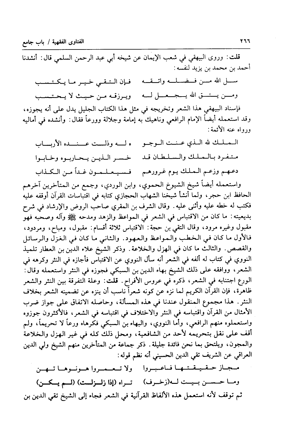 واستعمله أيضاً شيخ الشيوخ الحموي، وابن الوردي، وجمع من المتأخرين آخرهم الحافظ ابن حجر، ولما أنشأ شيخنا الشهاب الحجازي كتابه في اقتباسات القرآن أوقفه عليه فكتب له خطه عليه وأثنى عليه. وقال الشرف بن المقري صاحب الروض والإرشاد في شرح بديعيته: ما كان من الاقتباس في الشعر في المواعظ والزهد ومدحه صلى الله عليه وسلّم وآله وصحبه فهو مقبول وغيره مرود، وقال التقي بن حجة: الاقتباس ثلاثة أقسام: مقبول، ومباح، ومردود، فالأول ما كان في الخطب والمواعظ والعهود. والثاني ما كان في الغزل والرسائل والقصص. والثالث ما كان في الهزل والخلاعة. وذكر الشيخ علاء الدين بن العطار تلميذ النووي في كتاب له ألفه في الشعر أنه سأل النووي عن الاقتباس فأجازه في النثر وكرهه في الشعر، ووافقه على ذلك الشيخ بهاء الدين بن السبكي فجوزه في النثر واستعمله وقال: الورع اجتنابه في الشعر، ذكره في عروس الأفراح. قلت: وعلة التفرقة بين النثر والشعر ظاهرة، فإن القرآن الكريم لما نزه عن كونه شعراً ناسب أن ينزه عن تضمينه الشعر بخلاف النثر. هذا مجموع المنقول عندنا في هذه المسألة، وحاصله الاتفاق على جواز ضرب الأمثال من القرآن واقتباسه في النثر والاختلاف في اقتباسه في الشعر، فالأكثرون جوزوه واستعملوه منهم الرافعي، وأما النووي، والبهاء بن السبكي فكرهاه ورعاً لا تحريماً، ولم أقف على نقل بتحريمه لأحد من الشافعية، ومحل ذلك كله في غير الهزل والخلاعة والمجون، ويلتحق بما نحن فائدة جليلة. ذكر جماعة من المتأخرين منهم الشيخ ولي الدين العراقي عن الشريف تقي الدين الحسيني أنه نظم قوله: