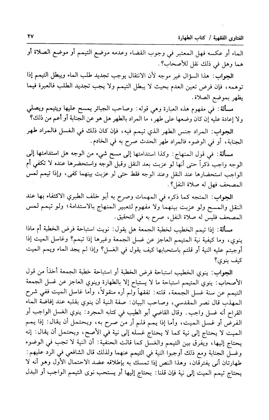 الجواب: المتجه كما ذكره في المهمات وصرح به أبو خلف الطبري الاكتفاء بها عند النقل والمسح ولو عزبت بينهما ولا مفهوم لتعبير المنهاج بالاستدامة؛ ولو تيمم لمس المصحف فليس له صلاة النفل، صرح به في التحقيق.