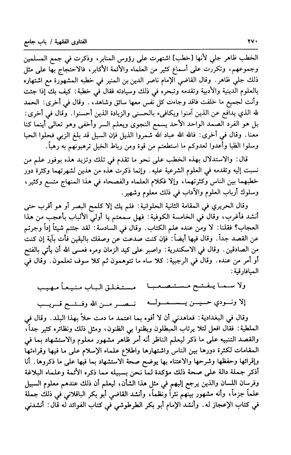 وقال في البغدادية: فعاهدني أن لا أفوه بما اعتمد ما دمت حلاً بهذا البلد. وقال في الملطية: فقال افعل لئلا يرتاب المبطلون ويظنوا بي الظنون، ومثل ذلك ونظائره كثير جداً، والقصد التنبيه على ما ذكر ليعلم الناظر أنه أمر ظاهر مشهور معلوم والاستشهاد بما في المقامات لكثرة دورها بين الناس واشتهارها واطلاع علماء الإسلام على ما فيها وقراءتها وإقرائها وحفظها وشرحها والاعتناء بها يوضح صحة الاستشهاد بما فيها على ما ذكروها. أنا أذكر جملة دالة على صحة ذلك مؤكدة لما نحن بسبيله مما ذكره الأئمة وعلماء البلاغة وفرسان اللسان والذين يرجع إليهم في مثل هذا الشأن، ليعلم أن ذلك عندهم معلوم السبيل علماً جزماً، وأنه مشهور بينهم نثراً ونظماً، وأنشد القاضي أبو بكر الباقلاني في ذلك جملة في كتاب الإعجاز له. وأنشد الإمام أبو بكر الطرطوشي في كتاب الفوائد له قال: أنشدني