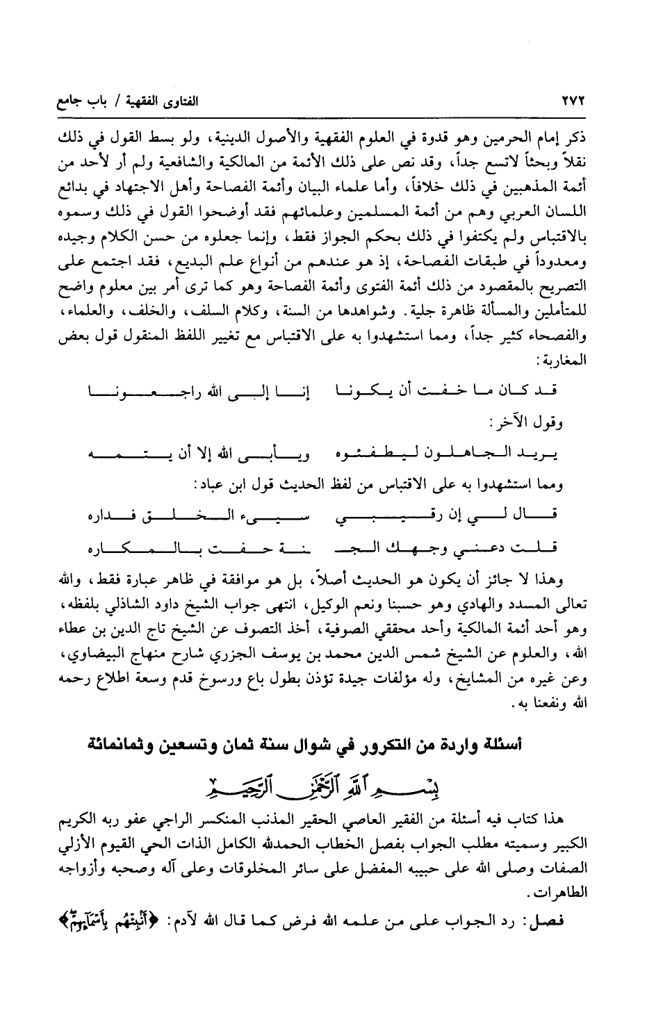 ذكر إمام الحرمين وهو قدوة في العلوم الفقهية والأصول الدينية، ولو بسط القول في ذلك نقلاً وبحثاً لاتسع جداً، وقد نص على ذلك الأئمة من المالكية والشافعية ولم أر لأحد من أئمة المذهبين في ذلك خلافاً، وأما علماء البيان وأئمة الفصاحة وأهل الاجتهاد في بدائع اللسان العربي وهم من أئمة المسلمين وعلمائهم فقد أوضحوا القول في ذلك وسموه بالاقتباس ولم يكتفوا في ذلك بحكم الجواز فقط، وإنما جعلوه من حسن الكلام وجيده ومعدوداً في طبقات الفصاحة، إذ هو عندهم من أنواع علم البديع، فقد اجتمع على التصريح بالمقصود من ذلك أئمة الفتوى وأئمة الفصاحة وهو كما ترى أمر بين معلوم واضح للمتأملين والمسألة ظاهرة جلية. وشواهدها من السنة، وكلام السلف، والخلف، والعلماء، والفصحاء كثير جداً، ومما استشهدوا به على الاقتباس مع تغيير اللفظ المنقول قول بعض المغاربة: