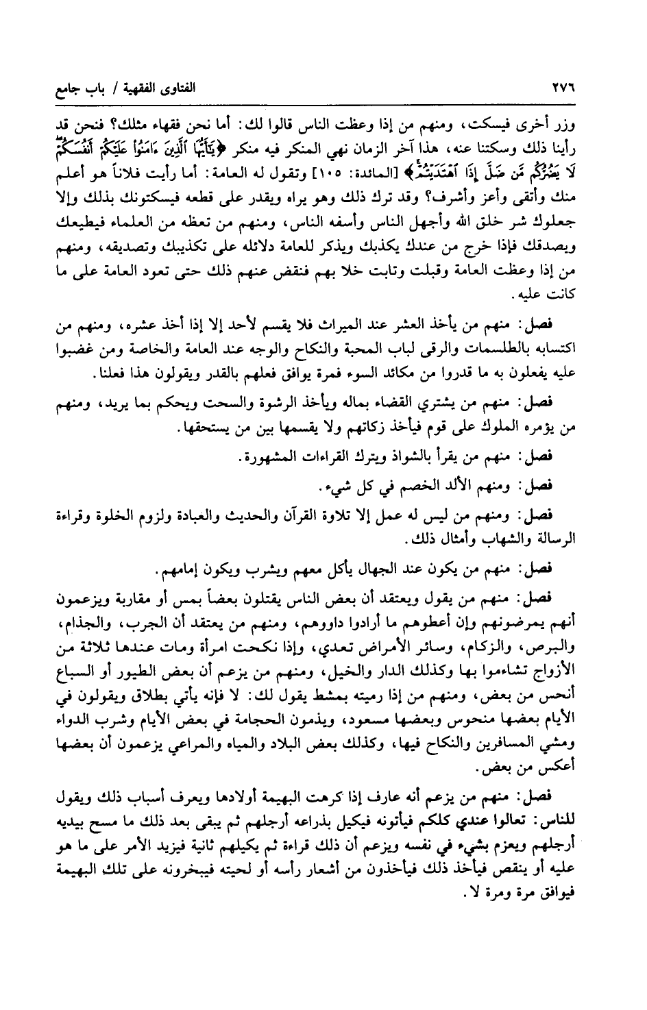 وزر أخرى فيسكت، ومنهم من إذا وعظت الناس قالوا لك: أما نحن فقهاء مثلك؟ فنحن قد رأينا ذلك وسكتنا عنه، هذا آخر الزمان نهي المنكر فيه منكر) يا أيها الذين آمنوا عليكم أنفسكم لا يضركم من ضل إذا اهتديتم (وتقول له العامة: أما رأيت فلاناً هو أعلم منك وأتقى وأعز وأشرف؟ وقد ترك ذلك وهو يراه ويقدر على قطعه فيسكتونك بذلك وإلا جعلوك شر خلق الله وأجهل الناس وأسفه الناس، ومنهم من تعظه من العلماء فيطيعك ويصدقك فإذا خرج من عندك يكذبك ويذكر للعامة دلائله على تكذيبك وتصديقه، ومنهم من إذا وعظت العامة وقبلت وتابت خلا بهم فتقض عنهم ذلك حتى تعود العامة على ما كانت عليه.