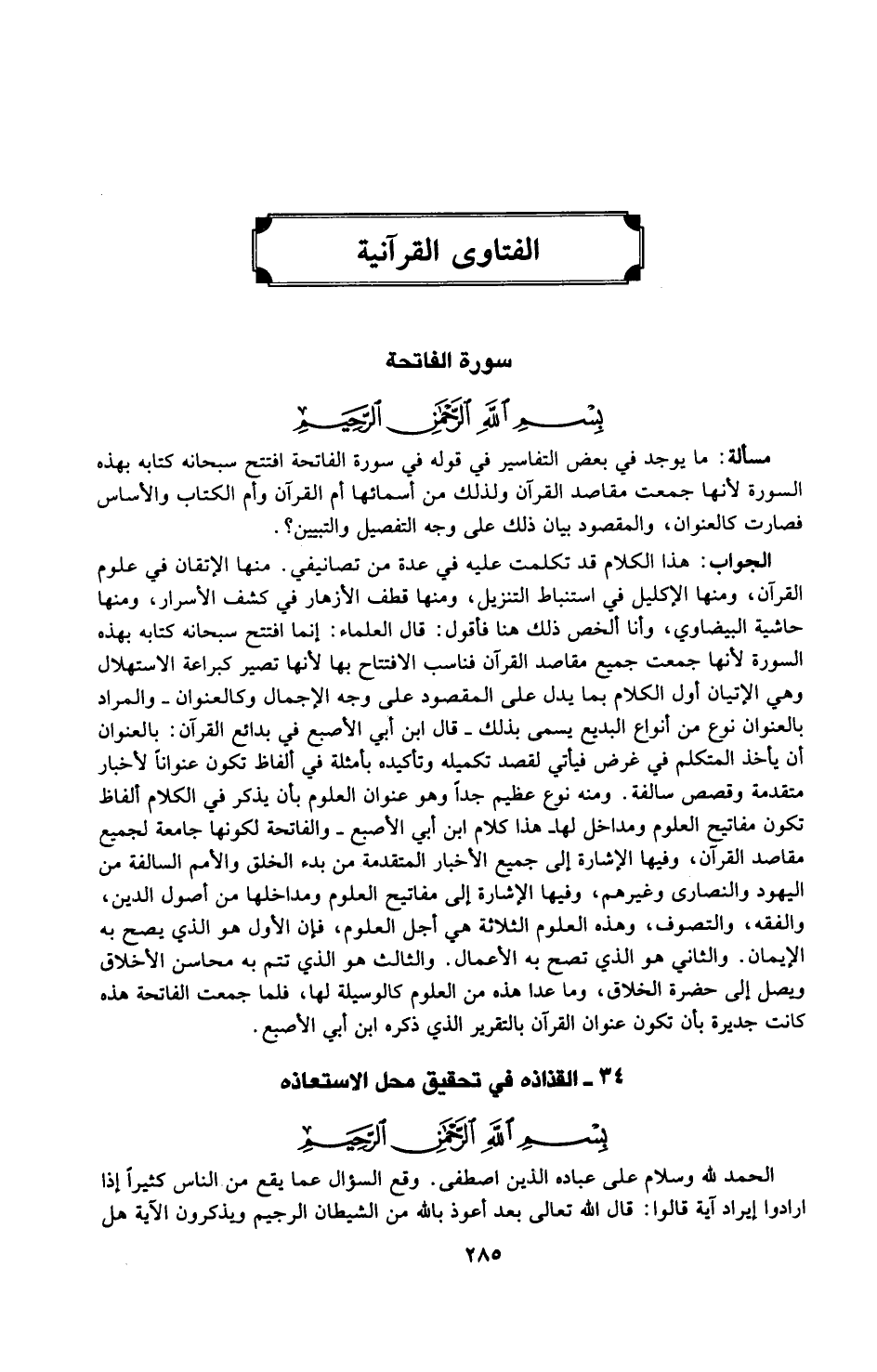الجواب: هذا الكلام قد تكلمت عليه في عدة من تصانيفي. منها الإتقان في علوم القرآن، ومنها الإكليل في استنباط التنزيل، ومنها قطف الأزهار في كشف الأسرار، ومنها حاشية البيضاوي، وأنا ألخص ذلك هنا فأقول: قال العلماء: إنما افتتح سبحانه كتابه بهذه السورة لأنها جمعت جميع مقاصد القرآن فناسب الافتتاح بها لأنها تصير كبراعة الاستهلال وهي الإتيان أول الكلام بما يدل على المقصود على وجه الإجمال وكالعنوان والمراد بالعنوان نوع من أنواع البديع يسمى بذلك قال ابن أبي الأصبع في بدائع القرآن: بالعنوان أن يأخذ المتكلم في غرض فيأتي لقصد تكميله وتأكيده بأمثلة في ألفاظ تكون عنواناً لأخبار متقدمة وقصص سالفة. ومنه نوع عظيم جداً وهو عنوان العلوم بأن يذكر في الكلام ألفاظ تكون مفاتيح العلوم ومداخل لها هذا كلام ابن أبي الأصبع والفاتحة لكونها جامعة لجميع مقاصد القرآن، وفيها الإشارة إلى جميع الأخبار المتقدمة من بدء الخلق والأمم السالفة من اليهود والنصاري وغيرهم، وفيها الإشارة إلى مفاتيح العلوم ومداخلها من أصول الدين، والفقه، والتصوف، وهذه العلوم الثلاثة هي أجل العلوم، فإن الأول هو الذي يصح به الإيمان. والثاني هو الذي تصح به الأعمال. والثالث هو الذي تتم به محاسن الأخلاق ويصل إلى حضرة الخلاق، وما عدا هذه من العلوم كالوسيلة لها، فلما جمعت الفاتحة هذه كانت جديرة بأن تكون عنوان القرآن بالتقرير الذي ذكره ابن أبي الأصبع.