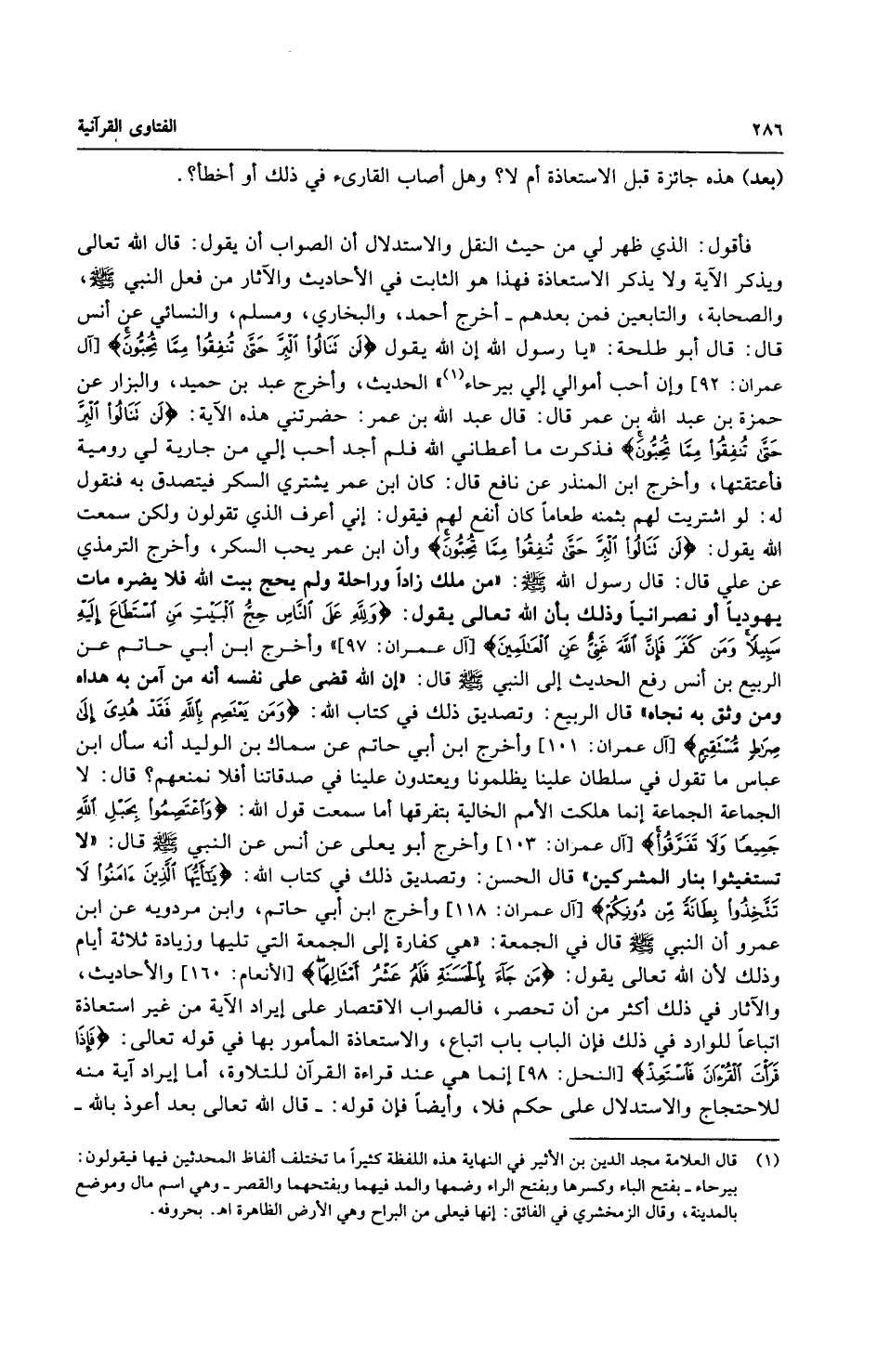 فأقول: الذي ظهر لي من حيث النقل والاستدلال أن الصواب أن يقول: قال الله تعالى ويذكر الآية ولا يذكر الاستعاذة فهذا هو الثابت في الأحاديث والآثار من فعل النبي صلى الله عليه وسلّم، والصحابة، والتابعين فمن بعدهم أخرج أحمد، والبخاري، ومسلم، والنسائي عن أنس قال: قال أبو طلحة: (يا رسول الله إن الله يقول) لن تنالوا البر حتى تنفقوا مما تحبون (وإن أحب أموالي إلى بير حاء) الحديث، وأخرج عبد بن حميد، والبزار عن حمزة بن عبد الله بن عمر قال: قال عبد الله بن عمر: حضرتني هذه الآية:) لن تنالوا البر حتى تنفقوا مما تحبون (فذكرت ما أعطاني الله فلم أجد أحب إلي من جارية لي رومية فأعتقتها، وأخرج ابن المنذر عن نافع قال: كان ابن عمر يشتري السكر فيتصدق به فنقول له: لو اشتريت لهم بثمنه طعاماً كان أنفع لهم فيقول: إني أعرف الذي تقولون ولكن سمعت الله يقول:) لن تنالوا البر حتى تنفقوا مما تحبون (وأن ابن عمر يحب السكر، وأخرج الترمذي عن علي قال: قال رسول الله صلى الله عليه وسلّم: (من ملك زاداً وراحلة ولم يحج بيت الله فلا يضره مات يهودياً أو نصرانياً وذلك بأن الله تعالى) يقول:) ولله على الناس حج البيت من استطاع إليه سبيلا ومن كفر فإن الله غني عن العالمين () وأخرج ابن أبي حاتم عن الربيع بن أنس رفع الحديث إلى النبي صلى الله عليه وسلّم قال: (إن الله قضى على نفسه أنه من آمن به هداه ومن وثق به نجاه) قال الربيع: وتصديق ذلك في كتاب الله:) ومن يعتصم بالله فقد هدى إلى صراط مستقيم (وأخرج ابن أبي حاتم عن سماك بن الوليد أنه سأل ابن عباس ما تقول في سلطان علينا يظلمونا ويعتدون علينا في صدقاتنا أفلا نمنعهم؟ قال: لا الجماعة الجماعة إنما هلكت الأمم الخالية بتفرقها أما سمعت قول الله:) واعتصموا بحبل الله جميعاً ولا تفرقوا (وأخرج أبو يعلى عن أنس عن النبي صلى الله عليه وسلّم قال: (لا تستغيثوا بنار المشركين) قال الحسن: وتصديق ذلك في كتاب الله:) يا أيها الذين آمنوا لا تتخذوا بطانة من دونكم (وأخرج ابن أبي حاتم، وابن مردويه عن ابن عمرو أن النبي صلى الله عليه وسلّم قال في الجمعة: (هي كفارة إلى الجمعة التي تليها وزيادة ثلاثة أيام وذلك لأن الله تعالى يقول:) من جاء بالحسنة فله عشر أمثالها () والأحاديث، والآثار في ذلك أكثر من أن تحصر، فالصواب الاقتصار على إيراد الآية من غير استعاذة اتباعاً للوارد في ذلك فإن الباب باب اتباع، والاستعاذة المأمور بها في قوله تعالى:) فإذا قرأت القرآن فاستعذ (إنما هي عند قراءة القرآن للتلاوة، أما إيراد آية منه للاحتجاج والاستدلال على حكم فلا، وأيضاً فإن قوله: قال الله تعالى بعد أعوذ بالله