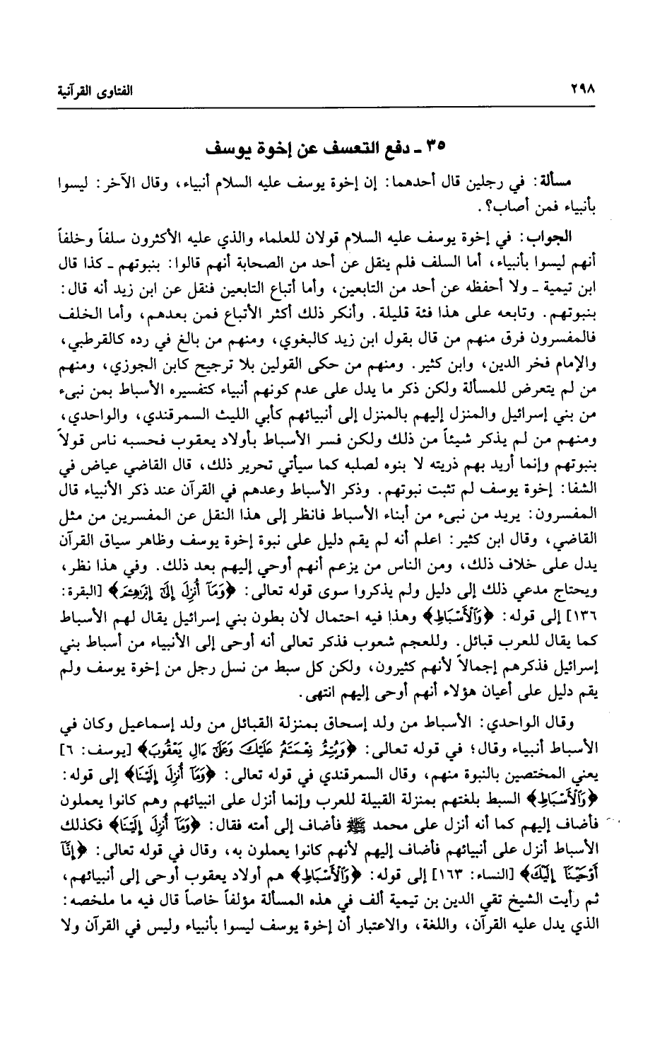 الجواب: في إخوة يوسف عليه السلام قولان للعلماء والذي عليه الأكثرون سلفاً وخلفاً أنهم ليسوا بأنبياء، أما السلف فلم ينقل عن أحد من الصحابة أنهم قالوا: بنبوتهم كذا قال ابن تيمية ولا أحفظه عن أحد من التابعين، وأما أتباع التابعين فنقل عن ابن زيد أنه قال: بنبوتهم. وتابعه على هذا فئة قليلة. وأنكر ذلك أكثر الأتباع فمن بعدهم، وأما الخلف فالمفسرون فرق منهم من قال بقول ابن زيد كالبغوي، ومنهم من بالغ في رده كالقرطبي، والإمام فخر الدين، وابن كثير. ومنهم من حكى القولين بلا ترجيح كابن الجوزي، ومنهم من لم يتعرض للمسألة ولكن ذكر ما يدل على عدم كونهم أنبياء كتفسيره الأسباط بمن نبىء من بني إسرائيل والمنزل إليهم بالمنزل إلى أنبيائهم كأبي الليث السمر قندي، والواحدى، ومنهم من لم يذكر شيئاً من ذلك ولكن فسر الأسباط بأولاد يعقوب فحسبه ناس قولاً بنبوتهم وإنما أريد بهم ذريته لا بنوه لصلبه كما سيأتي تحرير ذلك، قال القاضي عياض في الشفا: إخوة يوسف لم تثبت نبوتهم. وذكر الأسباط وعدهم في القرآن عند ذكر الأنبياء قال المفسرون: يريد من نبىء من أبناء الأسباط فانظر إلى هذا النقل عن المفسرين من مثل القاضي، وقال ابن كثير: اعلم أنه لم يقم دليل على نبوة إخوة يوسف وظاهر سياق القرآن يدل على خلاف ذلك، ومن الناس من يزعم أنهم أوحى إليهم بعد ذلك. وفي هذا نظر، ويحتاج مدعي ذلك إلى دليل ولم يذكروا سوى قوله تعالى:) وما أنزل إلى إبراهيم (إلى قوله:) والأسباط (وهذا فيه احتمال لأن بطون بني إسرائيل يقال لهم الأسباط كما يقال للعرب قبائل. وللعجم شعوب فذكر تعالى أنه أوحى إلى الأنبياء من أسباط بني إسرائيل فذكرهم إجمالاً لإنهم كثيرون، ولكن كل سبط من نسل رجل من إخوة يوسف ولم يقم دليل على أعيان هؤلاء أنهم أوحى إليهم انتهى.