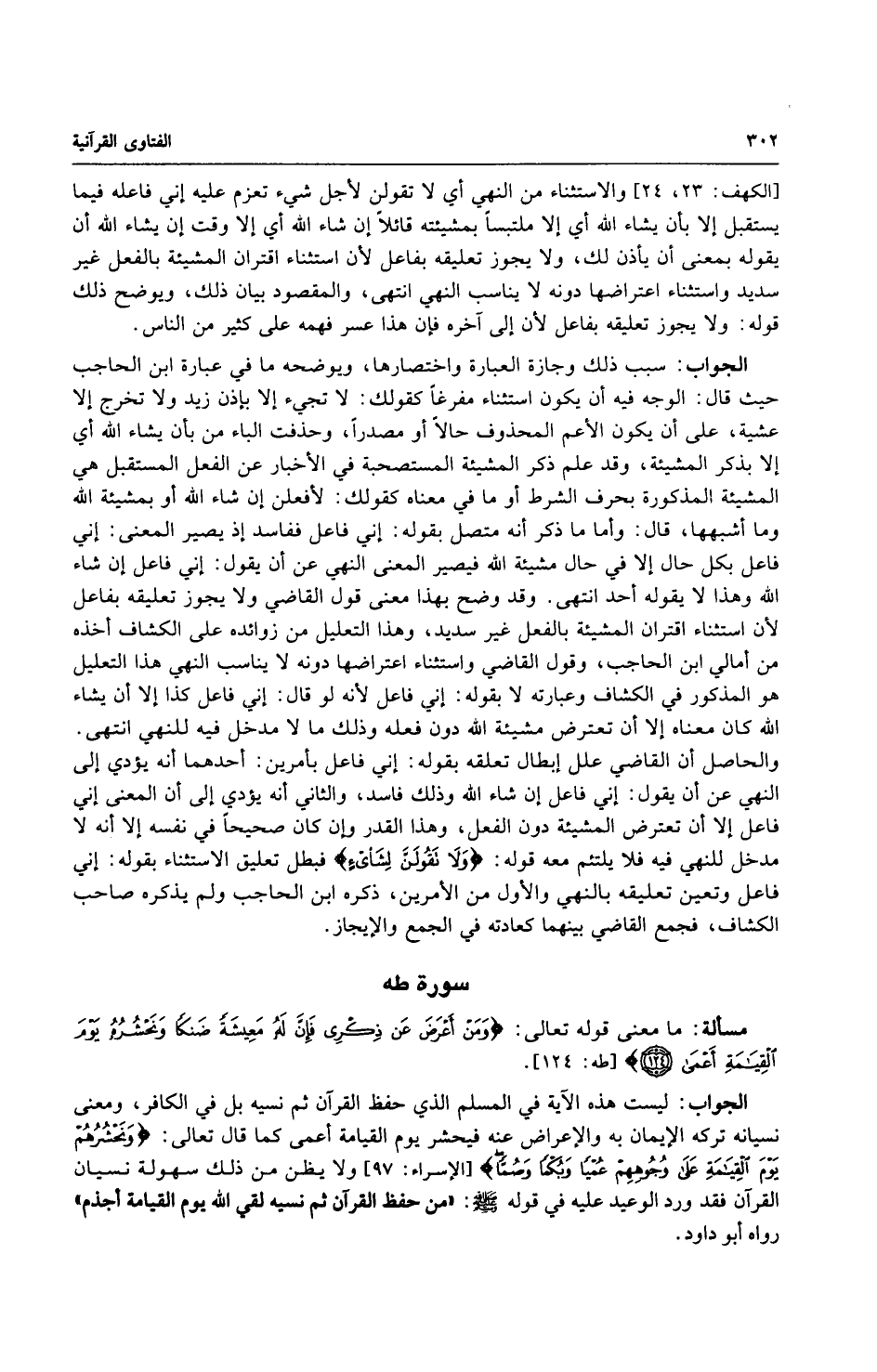 الجواب: ليست هذه الآية في المسلم الذي حفظ القرآن ثم نسيه بل في الكافر، ومعنى نسيانه تركه الإيمان به والإعراض عنه فيحشر يوم القيامة أعمى كما قال تعالى:) ونحشرهم يوم القيامة على وجوههم عمياً وبكماً وصماً (ولا يظن من ذلك سهولة نسيان القرآن فقد ورد الوعيد عليه في قوله صلى الله عليه وسلّم: (من حفظ القرآن ثم نسيه لقي الله يوم القيامة أجذم) رواه أبو داود.