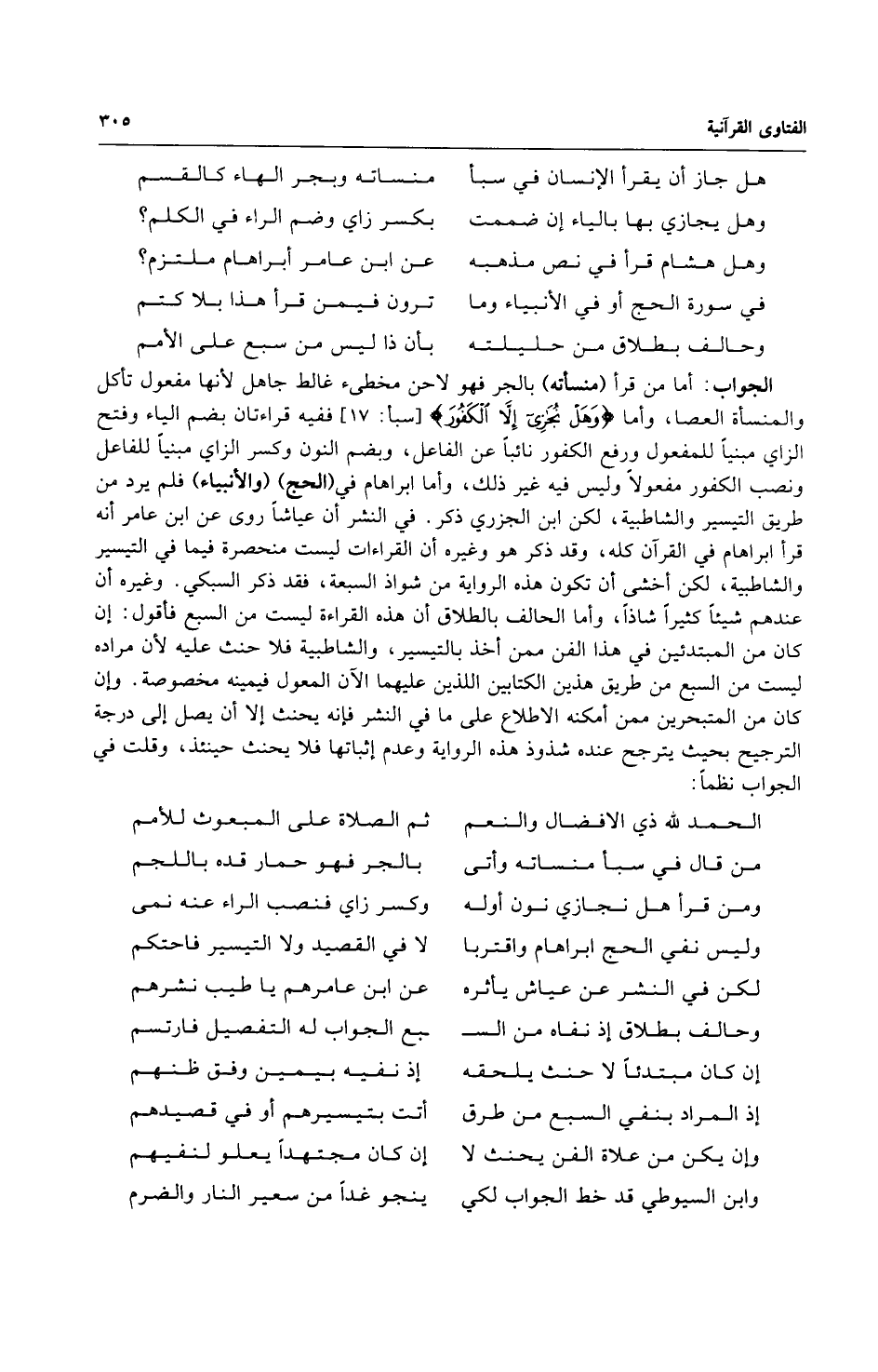الجواب: أما من قرأ (منسأته) بالجر فهو لاحن مخطىء غالط جاهل لأنها مفعول تأكل والمنسأة العصا، وأما) وهل يجازى إلا الكفور (ففيه قراءتان بضم الياء وفتح الزاي مبنياً للمفعول ورفع الكفور نائباً عن الفاعل، وبضم النون وكسر الزاي مبنياً للفاعل ونصب الكفور مفعولاً وليس فيه غير ذلك، وأما ابراهام في (الحج) (والأنبياء) فلم يرد من طريق التيسير والشاطبية، لكن ابن الجزري ذكر. في النشر أن عياشاً روى عن ابن عامر أنه قرأ ابراهام في القرآن كله، وقد ذكر هو وغيره أن القراءات ليست منحصرة فيما في التيسير والشاطبية، لكن أخشى أن تكون هذه الرواية من شواذ السبعة، فقد ذكر السبكي. وغيره أن عندهم شيئاً كثيراً شاذاً، وأما الحالف بالطلاق أن هذه القراءة ليست من السبع فأقول: إن كان من المبتدئين في هذا الفن ممن أخذ بالتيسير، والشاطبية فلا حنث عليه لأن مراده ليست من السبع من طريق هذين الكتابين اللذين عليهما الآن المعول فيمينه مخصوصة. وإن كان من المتبحرين ممن أمكنه الاطلاع على ما في النشر فإنه يحنث إلا أن يصل إلى درجة الترجيح بحيث يترجح عنده شذوذ هذه الرواية وعدم إثباتها فلا يحنث حينئذ، وقلت في الجواب نظماً: