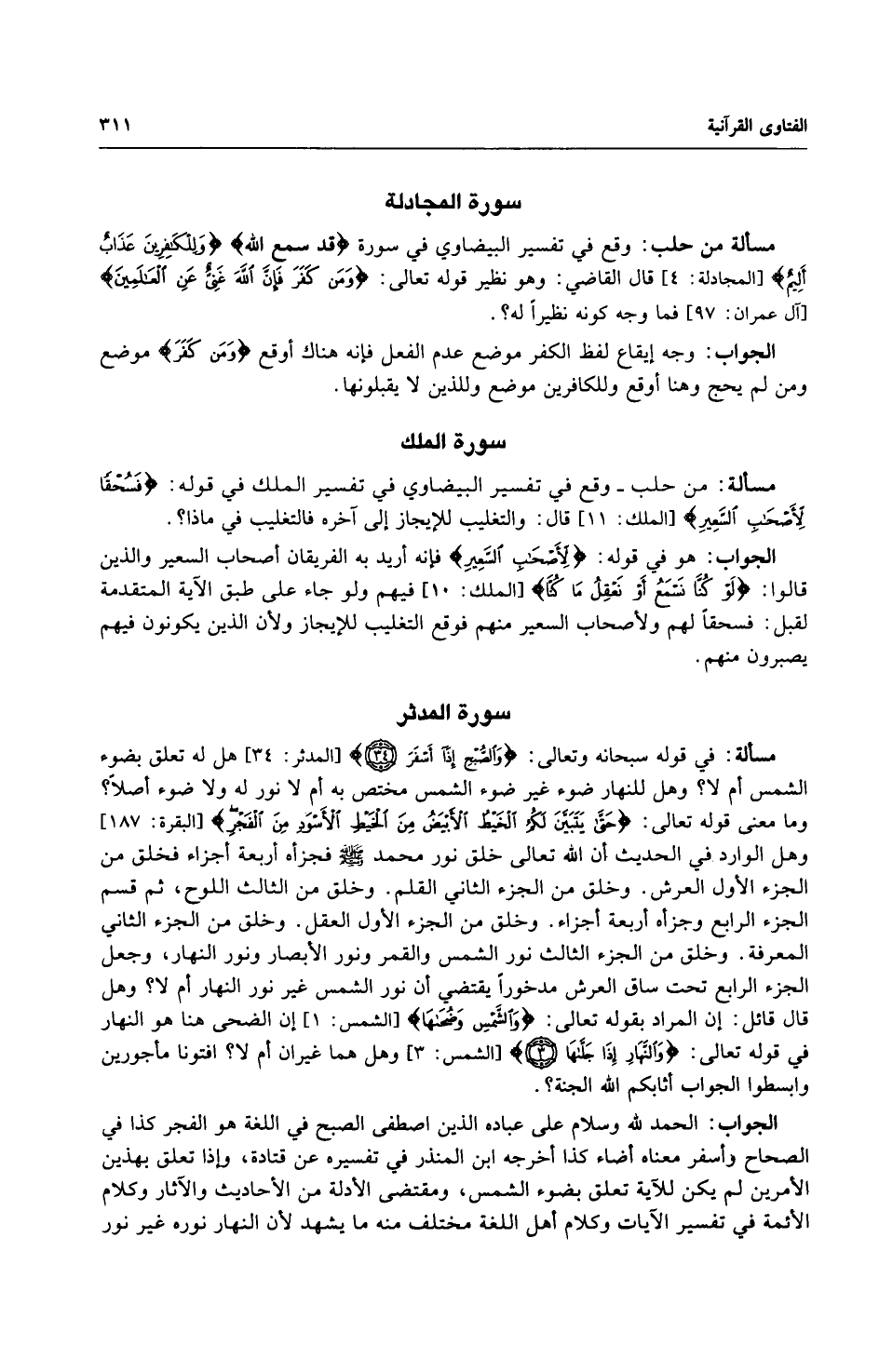 مسألة: في قوله سبحانه وتعالى:) والصبح إذا أسفر (هل له تعلق بضوء الشمس أم لا؟ وهل للنهار ضوء غير ضوء الشمس مختص به أم لا نور له ولا ضوء أصلاً؟ وما معنى قوله تعالى:) حتى يتبين لكم الخيط الأبيض من الخيط الأسود من الفجر (وهل الوارد في الحديث أن الله تعالى خلق نور محمد صلى الله عليه وسلّم فجزأه أربعة أجزاء فخلق من الجزء الأول العرش. وخلق من الجزء الثاني القلم. وخلق من الثالث اللوح، ثم قسم الجزء الرابع وجزأه أربعة أجزاء. وخلق من الجزء الأول العقل. وخلق من الجزء الثاني المعرفة. وخلق من الجزء الثالث نور الشمس والقمر ونور الأبصار ونور النهار، وجعل الجزء الرابع تحت ساق العرش مدخوراً يقتضي أن نور الشمس غير نور النهار أم لا؟ وهل قال قائل: أن المراد بقوله تعالى:) والشمس وضحاها (إن الضحى هنا هو النهار في قوله تعالى:) والنهار إذا جلاها (وهل هما غيران أم لا؟ افتونا مأجورين وابسطوا الجواب أثابكم الله الجنة؟.