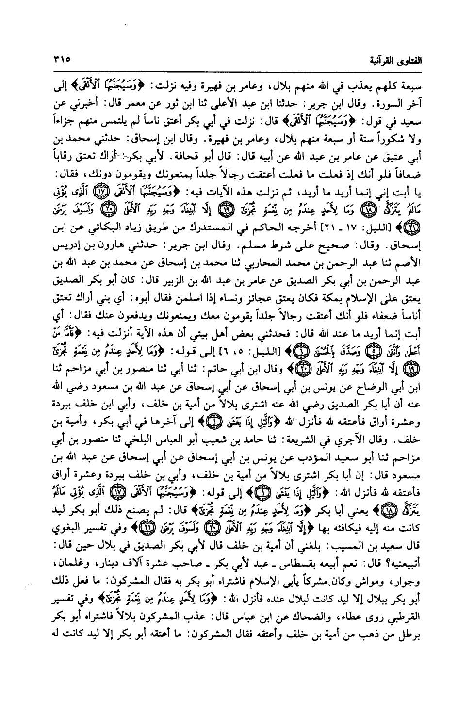 سبعة كلهم يعذب في الله منهم بلال، وعامر بن فهيرة وفيه نزلت:) وسيجنبها الأتقى (إلى آخر السورة. وقال ابن جرير: حدثنا ابن عبد الأعلى ثنا ابن ثور عن معمر قال: أخبرني عن سعيد في قول:) وسيجنبها الأتقى (قال: نزلت في أبي بكر أعتق ناساً لم يلتمس منهم جزاءاً ولا شكوراً ستة أو سبعة منهم بلال، وعامر بن فهيرة. وقال ابن إسحق: حدثني محمد بن أبي عتيق عن عامر بن عبد الله عن أبيه قال: قال أبو قحافة. لأبي بكر: أراك تعتق رقاباً ضعافاً فلو أنك إذ فعلت ما فعلت أعتقت رجالاً جلداً يمنعونك ويقومون دونك، فقال: يا أبت إني إنما أريد ما أريد، ثم نزلت هذه الآيات فيه:) وسيجنبها الأتقى الذي يؤتي ماله يتزكى وما لأحد عنده من نعمة تجزى إلا ابتغاء وجه ربه الأعلى ولسوف يرضى (أخرجه الحاكم في المستدرك من طريق زياد البكائي عن ابن إسحق. وقال: صحيح على شرط مسلم. وقال ابن جرير: حدثني هرون بن إدريس الأصم ثنا عبد الرحمن بن محمد المحاربي ثنا محمد بن إسحاق عن محمد بن عبد الله بن عبد الرحمن بن أبي بكر الصديق عن عامر بن عبد الله ابن الزبير قال: كان أبو بكر الصديق يعتق على الإسلام بمكة فكان يعتق عجائز ونساء إذا اسلمن فقال أبوه: أي بني أراك تعتق أناساً ضعفاء فلو أنك أعتقت رجالاً جلداً يقومون معك ويمنعونك ويدفعون عنك فقال: أي أبت إنما أريد ما عند الله قال: فحدثني بعض أهل بيتي أن هذه الآية أنزلت فيه:) فأما من أعطى وأتقى وصدق بالحسنى (إلى قوله:) وما لأحد عنده من نعمة تجزى إلا ابتغاء وجه ربه الأعلى (وقال ابن أبي حاتم: ثنا أبي ثنا منصور بن أبي مزاحم ثنا ابن أبي الوضاح عن يونس بن أبي إسحاق عن أبي إسحاق عن عبد الله بن مسعود رضي الله عنه أن أبا بكر الصديق رضي الله عنه اشترى بلالاً من أمية بن خلف، وأبي ابن خلف ببردة وعشرة أواق فأعتقه لله فأنزل الله) والليل إذا يغشى (إلى آخرها في أبي بكر، وأمية بن خلف. وقال الآجري في الشريعة: ثنا حامد بن شعيب أبو العباس البلخي ثنا منصور ابن أبي مزاحم ثنا أبو سعيد المؤدب عن يونس بن أبي إسحاق عن أبي إسحاق عن عبد الله بن مسعود قال: إن أبا بكر اشترى بلالاً من أمية بن خلف، وأبي بن خلف ببردة وعشرة أواق فأعتقه لله فأنزل الله:) والليل إذا ايغشى (إلى قوله:) وسيجنبها الأتقى الذي يؤتي ماله يتزكى (يعني أبا بكر) وما لأحد عنده من نعمة تجزى (قال: لم يصنع ذلك أبو بكر ليد كانت منه إليه فيكافئه بها) إلا ابتغاء وجه ربه الأعلى ولسوف يرضى (وفي تفسير البغوي قال سعيد بن المسيب: بلغني أن أمية بن خلف قال لأبي بكر الصديق في بلال حين قال: أتبيعنيه؟ قال: نعم أبيعه بقسطاس عبد لأبي بكر صاحب عشرة آلاف دينار، وغلمان، وجوار، ومواش وكان مشركاً يأبى الإسلام فاشتراه أبو بكر به فقال المشركون: ما فعل ذلك أبو بكر ببلال إلا ليد كانت لبلال عنده فأنزل الله:) وما لأحد عنده من نعمة تجزى (وفي تفسير القرطبي روى عطاء، والضحاك عن ابن عباس قال: عذب المشركون بلالاً فاشتراه أبو بكر برطل من ذهب من أمية بن خلف وأعتقه فقال المشركون: ما أعتقه أبو بكر إلا ليد كانت له