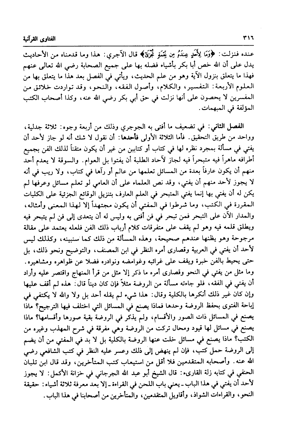 الفصل الثاني: في تضعيف ما أفتى به الجوجري وذلك من أربعة وجوه: ثلاثة جدلية، وواحد من طريق التحقيق. فأما الثلاثة الأولى فأحدها: أن نقول لا شك أنه لو جاز لأحد أن يفتي في مسألة بمجرد نظره لها في كتاب أو كتابين من غير أن يكون متقناً لذلك الفن بجميع أطرافه ماهراً فيه متبحراً فيه لجاز لآحاد الطلبة أن يفتوا بل العوام. والسوقة لا يعدم أحد منهم أن يكون عارفاً بعدة من المسائل تعلمها من عالم أو رآها في كتاب، ولا ريب في أنه لا يجوز لأحد منهم أن يفتي، وقد نص العلماء على أن العامي لو تعلم مسائل وعرفها لم يكن له أن يفتي بها إنما يفتى المتبحر في العلم العارف بتنزيل الوقائع الجزئية على الكليات المقررة في الكتب، وما شرطوا في المفتي أن يكون مجتهداً إلا لهذا المعنى وأمثاله، والمدار الآن على التبحر فمن تبحر في فن أفتى به وليس له أن يتعدى إلى فن لم يتبحر فيه ويطلق قلمه فيه وهو لم يقف على متفرقات كلام أرباب ذلك الفن فلعله يعتمد على مقالة مرجوحة وهو يظنها عندهم صحيحة، وهذه المسألة من ذلك كما سنبينه، وكذلك ليس لأحد أن يفتي في العربية وقصارى أمره النظر في ابن المصنف، والتوضيح ونحو ذلك، بل حتى يحيط بالفن خبرة ويقف على غرائبه وغوامضه ونوادره فضلا عن ظواهره ومشاهيره. وما مثل من يفتي في النحو وقصارى أمره ما ذكر إلا مثل من قرأ المنهاج واقتصر عليه وأراد أن يفتي في الفقه، فلو جاءته مسألة من الروضة مثلاً فإن كان ديناً قال: هذه لم أقف عليها وإن كان غير ذلك أنكرها بالكلية وقال: هذا شيء لم يقله أحد بل ولا والله لا يكتفي في إباحة الفتوى بحفظ الروضة وحدها فماذا يصنع في المسائل التي اختلف فيها الترجيح؟ ماذا يصنع في المسائل ذات الصور والأقسام، ولم يذكر في الروضة بقية صورها وأقسامها؟ ماذا يصنع في مسائل لها قيود ومحال تركت من الروضة وهي مفرقة في شرح المهذب وغيره من الكتب؟ ماذا يصنع في مسائل خلت عنها الروضة بالكلية بل لا بد في المفتي من أن يضم إلى الروضة حمل كتب، فإن لم ينهض إلى ذلك وعسر عليه النظر في كتب الشافعي رضي الله عنه. وأصحابه المتقدمين فلا أقل من استيعاب كتب المتأخرين، وقد قال ابن تلبان الحنفي في كتابه زلة القارىء: قال الشيخ أبو عبد الله الجرجاني في خزانة الأكمل: لا يجوز لأحد أن يفتي في هذا الباب يعني باب اللحن في القراءة إلا بعد معرفة ثلاثة أشياء: حقيقة النحو، والقراءات الشواذ، وأقاويل المتقدمين، والمتأخرين من أصحابنا في هذا الباب.