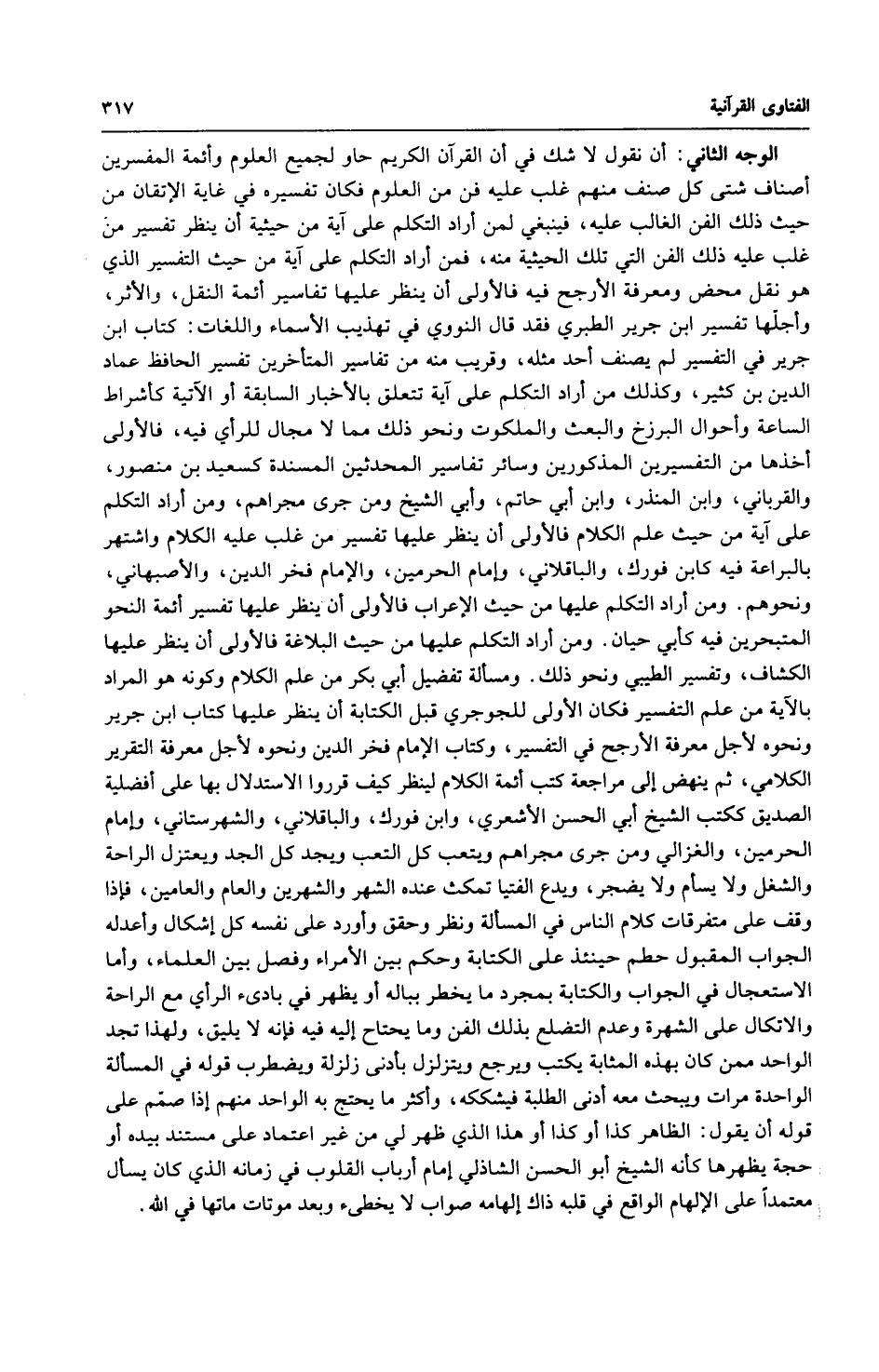 الوجه الثاني: أن نقول لا شك في أن القرآن الكريم حاو لجميع العلوم وأئمة المفسرين أصناف شتى كل صنف منهم غلب عليه فن من العلوم فكان تفسيره في غاية الإتقان من حيث ذلك الفن الغالب عليه، فينبغي لمن أراد التكلم على آية من حيثية أن ينظر تفسير من غلب عليه ذلك الفن التي تلك الحيثية منه، فمن أراد التكلم على آية من حيث التفسير الذي هو نقل محض ومعرفة الأرجح فيه فالأولى أن ينظر عليها تفاسير أئمة النقل، والأثر، وأجلّها تفسير ابن جرير الطبري فقد قال النووي في تهذيب الأسماء واللغات: كتاب ابن جرير في التفسير لم يصنف أحد مثله، وقريب منه من تفاسير المتأخرين تفسير الحافظ عماد الدين بن كثير، وكذلك من أراد التكلم على آية تتعلق بالأخبار السابقة أو الآتية كأشراط الساعة وأحوال البرزخ والبعث والملكوت ونحو ذلك مما لا مجال للرأي فيه، فالأولى أخذها من التفسيرين المذكورين وسائر تفاسير المحدثين المسندة كسعيد بن منصور، والقرباني، وابن المنذر، وابن أبي حاتم، وأبي الشيخ ومن جرى مجراهم، ومن أراد التكلم على آية من حيث علم الكلام فالأولى أن ينظر عليها تفسير من غلب عليه الكلام واشتهر بالبراعة فيه كابن فورك، والباقلاني، وإمام الحرمين، والإمام فخر الدين، والأصبهاني، ونحوهم. ومن أراد التكلم عليها من حيث الإعراب فالأولى أن ينظر عليها تفسير أئمة النحو المتبحرين فيه كأبي حيان. ومن أراد التكلم عليها من حيث البلاغة فالأولى أن ينظر عليها الكشاف، وتفسير الطيبي ونحو ذلك. ومسألة تفضيل أبي بكر من علم الكلام وكونه هو المراد بالآية من علم التفسير فكان الأولى للجوجري قبل الكتابة أن ينظر عليها كتاب ابن جرير ونحوه لأجل معرفة الأرجح في التفسير، وكتاب الإمام فخر الدين ونحوه لأجل معرفة التقرير الكلامي، ثم ينهض إلى مراجعة كتب أئمة الكلام لينظر كيف قرروا الاستدلال بها على أفضلية الصديق ككتب الشيخ أبي الحسن الأشعري، وابن فورك، والباقلاني، والشهر ستاني، وإمام الحرمين، والغزالي ومن جرى مجراهم ويتعب كل التعب ويجد كل الجد ويعتزل الراحة والشغل ولا يسأم ولا يضجر، ويدع الفتيا تمكث عنده الشهر والشهرين والعام والعامين، فإذا وقف على متفرقات كلام الناس في المسألة ونظر وحقق وأورد على نفسه كل إشكال وأعدله الجواب المقبول حطم حينئذ على الكتابة وحكم بين الأمراء وفصل بين العلماء، وأما الاستعجال في الجواب والكتابة بمجرد ما يخطر بباله أو يظهر في بادىء الرأي مع الراحة والاتكال على الشهرة وعدم التضلع بذلك الفن وما يحتاح إليه فيه فإنه لا يليق، ولهذا تجد الواحد ممن كان بهذه المثابة يكتب ويرجع ويتزلزل بأدنى زلزلة ويضطرب قوله في المسألة الواحدة مرات ويبحث معه أدنى الطلبة فيشككه، وأكثر ما يحتج به الواحد منهم إذا صمّم على قوله أن يقول: الظاهر كذا أو كذا أو هذا الذي ظهر لي من غير اعتماد على مستند بيده أوحجة يظهرها كأنه الشيخ أبو الحسن الشاذلي إمام أرباب القلوب في زمانه الذي كان يسأل معتمداً على الإلهام الواقع في قلبه ذاك إلهامه صواب لا يخطىء وبعد موتات ماتها في الله.