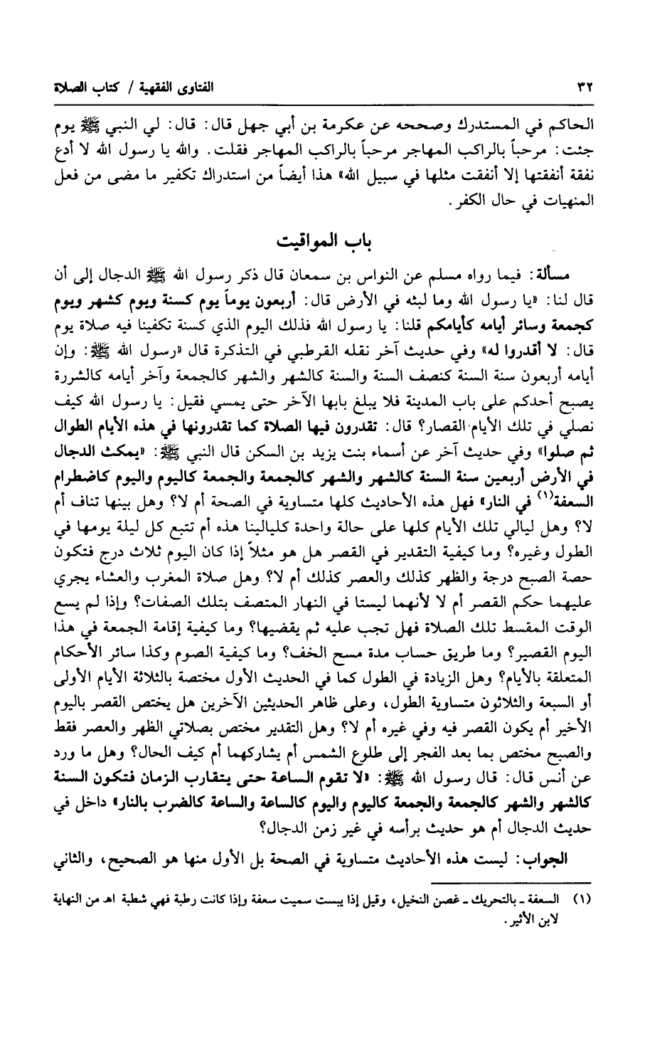 مسألة: فيما رواه مسلم عن النواس بن سمعان قال: ذكر رسول الله صلى الله عليه وسلّم الدجال إلى أن قال قلنا: (يا رسول الله وما لبثه في الأرض؟ قال: أربعون يوماً يوم كسنة ويوم كشهر ويوم كجمعة وسائر أيامه كأيامكم قلنا: يا رسول الله فذلك اليوم الذي كسنة تكفينا فيه صلاة يوم قال: (لا أقدروا له) وفي حديث آخر نقله القرطبي في التذكرة قال (رسول الله صلى الله عليه وسلّم: وأن أيامه أربعون سنة السنة كنصف السنة والسنة كالشهر والشهر كالجمعة وآخر أيامه كالشررة يصبح أحدكم على باب المدينة فلا يبلغ بابها الآخر حتى يمسي، فقيل: يا رسول الله كيف نصلي في تلك الأيام القصار؟ قال: (تقدرون فيها الصلاة كما تقدرونها في هذه الأيام الطوال ثم صلوا) وفي حديث آخر عن أسماء بنت يزيد بن السكن قال النبي صلى الله عليه وسلّم: (يمكث الدجال في الأرض أربعين سنة السنة كالشهر والشهر كالجمعة والجمعة كاليوم واليوم كاضطرام السعفة في النار) فهل هذه الأحاديث كلها متساوية في الصحة أم لا؟ وهل بينها تناف أم لا؟ وهل ليالي تلك الأيام كلها على حالة واحدة كليالينا هذه أم تتبع كل ليلة يومها في الطول وغيره؟ وما كيفية التقدير في القصر هل هو مثلاً إذا كان اليوم ثلاث درج فتكون حصة الصبح درجة والظهر كذلك والعصر كذلك أم لا؟ وهل صلاة المغرب والعشاء يجري عليهما حكم القصر أم لا لأنهما ليستا في النهار المتصف بتلك الصفات؟ وإذا لم يسع الوقت المقسط تلك الصلاة فهل تجب عليه ثم يقضيها؟ وما كيفية إقامة الجمعة في هذا اليوم القصير؟ وما طريق حساب مدة مسح الخف؟ وما كيفية الصوم وكذا سائر الأحكام المتعلقة بالأيام؟ وهل الزيادة في الطول كما في الحديث الأول مختصة بالثلاثة الأيام الأولى أو السبعة والثلاثون متساوية الطول، وعلى ظاهر الحديثين الآخرين هل يختص القصر باليوم الأخير أم يكون القصر فيه وفي غيره أم لا؟ وهل التقدير مختص بصلاتي الظهر والعصر فقط والصبح مختص بما بعد الفجر إلى طلوع الشمس أم يشاركهما أم كيف الحال؟ وهل ما ورد عن أنس قال: قال رسول الله صلى الله عليه وسلّم: (لا تقوم الساعة حتى يتقارب الزمان فتكون السنة كالشهر والشهر كالجمعة والجمعة كاليوم واليوم كالساعة والساعة كالضرب بالنار) داخل في حديث الدجال أم هو حديث برأسه في غير زمن الدجال؟.