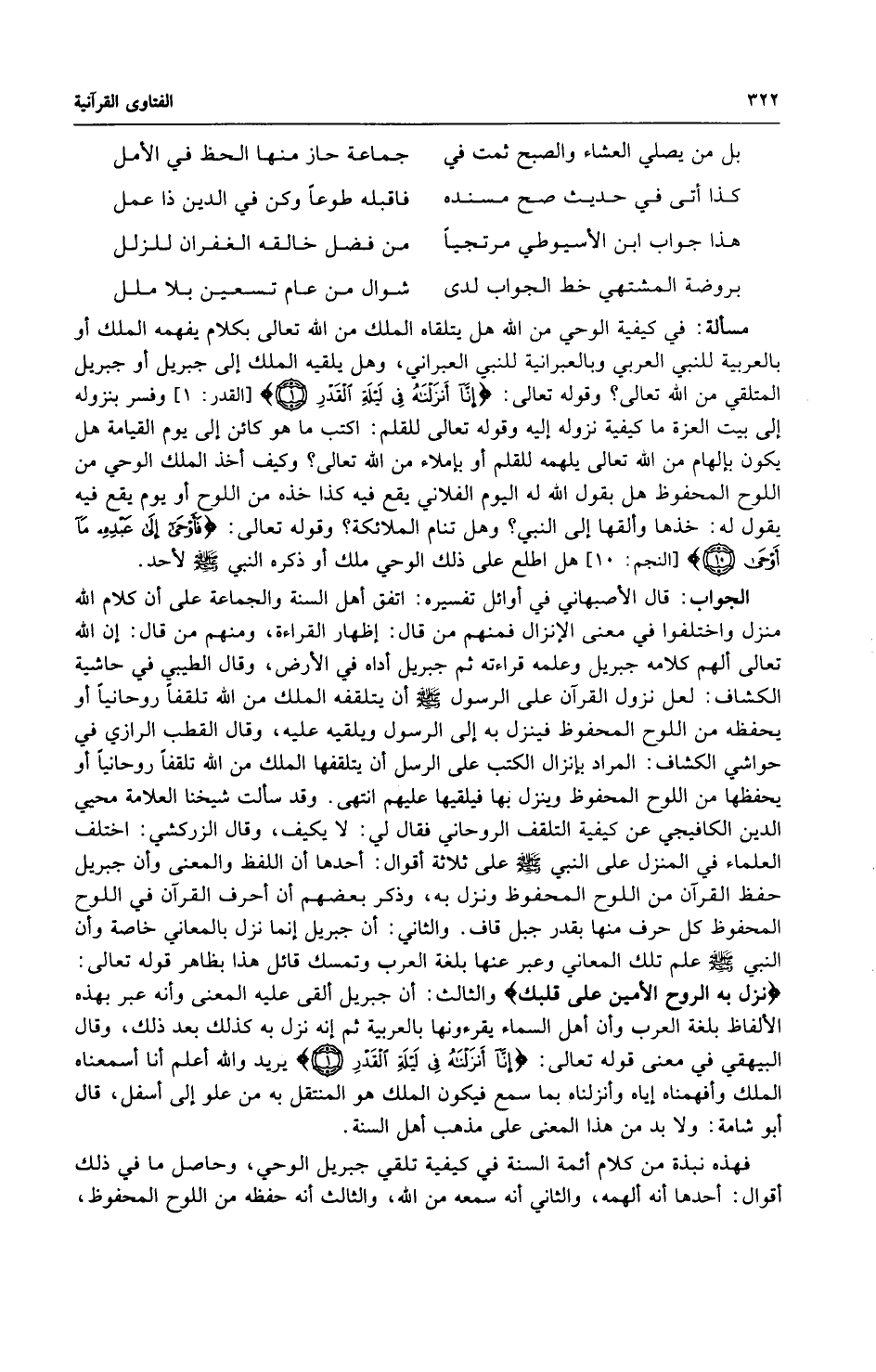شوال من عام تسعين بلا ملل مسألة : في كيفية الوحي من الله هل يتلقاه الملك من الله تعالى بكلام يفهمه الملك أو بالعربية للنبي العربي وبالعبرانية للنبي العبراني ، وهل يلقيه الملك إلى جبريل أو جبريل المتلقي من الله تعالى ؟ وقوله تعالى : ) إنا أنزلناه في ليلة القدر ( وفسر بنزوله إلى بيت العزة ما كيفية نزوله إليه وقوله تعالى للقلم : اكتب ما هو كائن إلى يوم القيامة هل يكون بإلهام من الله تعالى يلهمه للقلم أو بإملاء من الله تعالى ؟ وكيف أخذ الملك الوحي من اللوح المحفوظ هل بقول الله له اليوم الفلاني يقع فيه كذا خذه من اللوح أو يوم يقع فيه يقول له : خذها وألقها إلى النبي ؟ وهل تنام الملائكة ؟ وقوله تعالى : ) فأوحى إلى عبده ما أوحى ( هل اطلع على ذلك الوحي ملك أو ذكره النبي صلى الله عليه وسلّم لأحد.