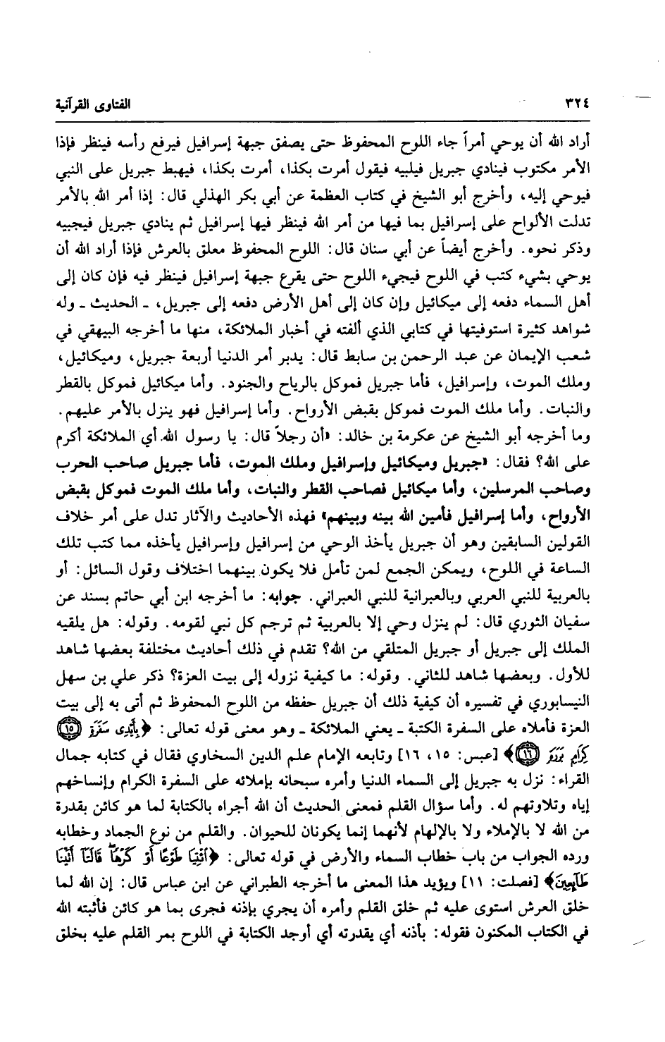 أراد الله أن يوحي أمراً جاء اللوح المحفوظ حتى يصفق جبهة إسرافيل فيرفع رأسه فينظر فإذا الأمر مكتوب فينادي جبريل فيلبيه فيقول أمرت بكذا، أمرت بكذا، فيهبط جبريل على النبي فيوحي إليه، وأخرج أبو الشيخ في كتاب العظمة عن أبي بكر الهذلي قال: إذا أمر الله بالأمر تدلت الألواح على إسرافيل بما فيها من أمر الله فينظر فيها إسرافيل ثم ينادي جبريل فيجبيه وذكر نحوه. وأخرج أيضاً عن أبي سنان قال: اللوح المحفوظ معلق بالعرش فإذا أراد الله أن يوحي بشيء كتب في اللوح فيجيء اللوح حتى يقرع جبهة إسرافيل فينظر فيه فإن كان إلى أهل السماء دفعه إلى ميكائيل وإن كان إلى أهل الأرض دفعه إلى جبريل، الحديث وله شواهد كثيرة استوفيتها في كتابي الذي ألفته في أخبار الملائكة، منها ما أخرجه البيهقي في شعب الإيمان عن عبد الرحمن بن سابط قال: يدبر أمر الدنيا أربعة جبريل، وميكائيل، وملك الموت، وإسرافيل، فأما جبريل فموكل بالرياح والجنود. وأما ميكائيل فموكل بالقطر والنبات. وأما ملك الموت فموكل بقبض الأرواح. وأما إسرافيل فهو ينزل بالأمر عليهم. وما أخرجه أبو الشيخ عن عكرمة بن خالد: (أن رجلاً قال: يا رسول الله أي الملائكة أكرم على الله؟ فقال: (جبريل وميكائيل وإسرافيل وملك الموت، فأما جبريل صاحب الحرب وصاحب المرسلين، وأما ميكائيل فصاحب القطر والنبات، وأما ملك الموت فموكل بقبض الأرواح، وأما إسرافيل فأمين الله بينه وبينهم) فهذه الأحاديث والآثار تدل على أمر خلاف القولين السابقين وهو أن جبريل يأخذ الوحي من إسرافيل وإسرافيل يأخذه مما كتب تلك الساعة في اللوح، ويمكن الجمع لمن تأمل فلا يكون بينهما اختلاف وقول السائل: أو بالعربية للنبي العربي وبالعبرانية للنبي العبراني. جوابه: ما أخرجه ابن أبي حاتم بسند عن سفيان الثوري قال: لم ينزل وحي إلا بالعربية ثم ترجم كل نبي لقومه. وقوله: هل يلقيه الملك إلى جبريل أو جبريل المتلقي من الله؟ تقدم في ذلك أحاديث مختلفة بعضها شاهد للأول. وبعضها شاهد للثاني. وقوله: ما كيفية نزوله إلى بيت العزة؟ ذكر علي بن سهل النيسابوري في تفسيره أن كيفية ذلك أن جبريل حفظه من اللوح المحفوظ ثم أتى به إلى بيت العزة فأملاه على السفرة الكتبة يعني الملائكة وهو معنى قوله تعالى:) بأيدي سفرة كرام بررة (وتابعه الإمام علم الدين السخاوي فقال في كتابه جمال القراء: نزل به جبريل إلى السماء الدنيا وأمره سبحانه بإملائه على السفرة الكرام وإنساخهم إياه وتلاوتهم له. وأما سؤال القلم فمعنى الحديث أن الله أجراه بالكتابة لما هو كائن بقدرة من الله لا بالإملاء ولا بالإلهام لأنهما إنما يكونان للحيوان. والقلم من نوع الجماد وخطابه ورده الجواب من باب خطاب السماء والأرض في قوله تعالى:) ائتيا طوعاً أو كرهاً قالتا أتينا طائعين (ويؤيد هذا المعنى ما أخرجه الطبراني عن ابن عباس قال: إن الله لما خلق العرش استوى عليه ثم خلق القلم وأمره أن يجري بإذنه فجرى بما هو كائن فأثبته الله في الكتاب المكنون فقوله: بأذنه أي يقدرته أي أوجد الكتابة في اللوح بمر القلم عليه بخلق
