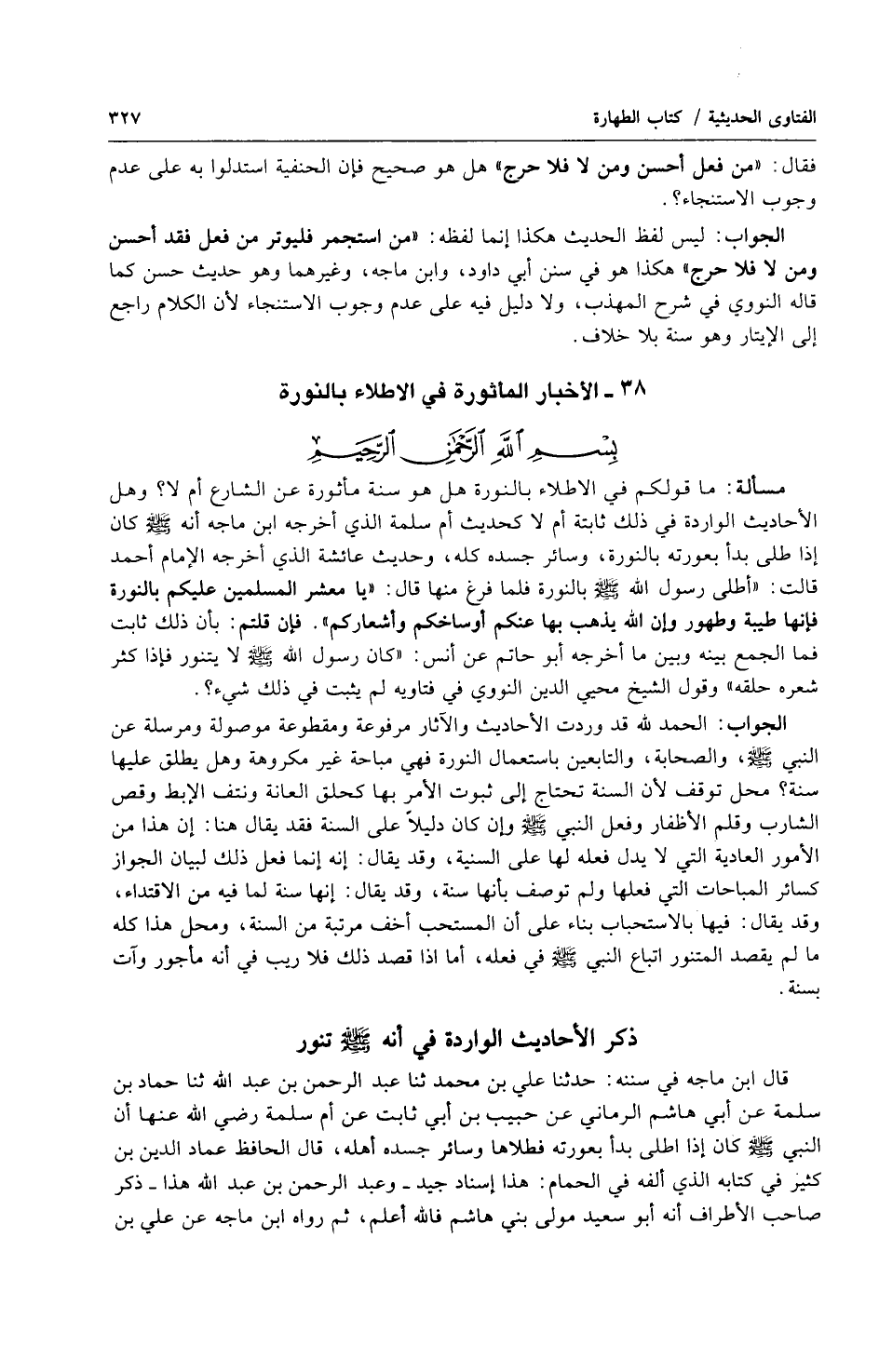 مسألة: ما قولكم في الإطلاء بالنورة هل هو سنة مأثورة عن الشارع أم لا؟ وهل الأحاديث الواردة في ذلك ثابتة أم لا كحديث أم سلمة الذي أخرجه ابن ماجه أنه صلى الله عليه وسلّم كان إذا طلى بدأ بعورته بالنورة، وسائر جسده كله، وحديث عائشة الذي أخرجه الإمام أحمد قالت: (أطلى رسول الله صلى الله عليه وسلّم بالنورة فلما فرغ منها قال: (يا معشر المسلمين عليكم بالنورة فإنها طيبة وطهور وإن الله يذهب بها عنكم أوساخكم وأشعاركم). فإن قلتم: بأن ذلك ثابت فما الجمع بينه وبين ما أخرجه أبو حاتم عن أنس: (كان رسول الله صلى الله عليه وسلّم لا يتنور فإذا كثر شعره حلقه) وقول الشيخ محي الدين النووي في فتاويه لم يثبت في ذلك شيء؟.