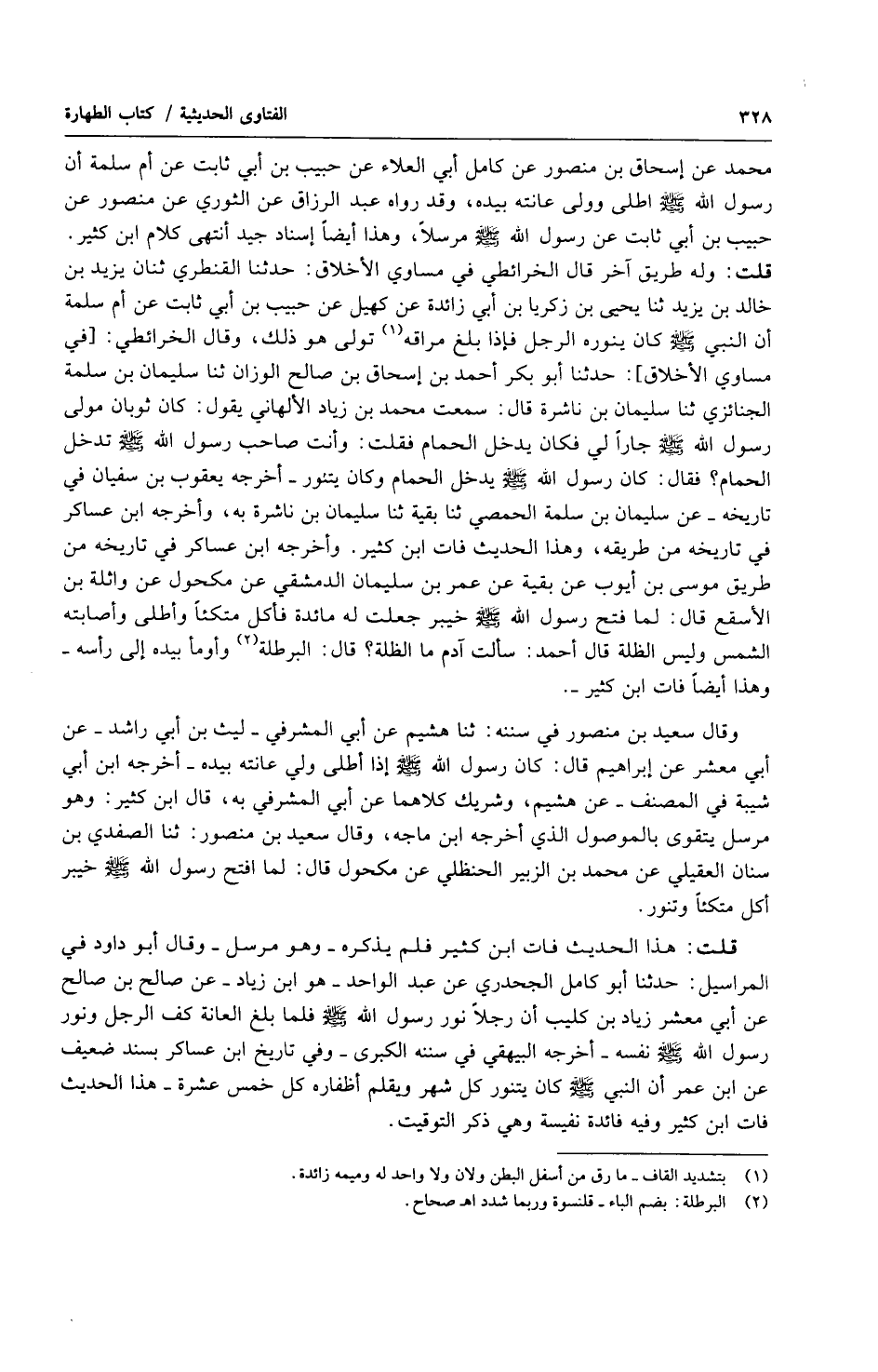 محمد عن إسحاق بن منصور عن كامل أبي العلاء عن حبيب بن أبي ثابت عن أم سلمة أن رسول الله صلى الله عليه وسلّم اطلى وولى عانته بيده، وقد رواه عبد الرزاق عن الثوري عن منصور عن حبيب بن أبي ثابت عن رسول الله صلى الله عليه وسلّم مرسلاً، وهذا أيضاً إسناد جيد أنتهى كلام ابن كثير. قلت: وله طريق آخر قال الخرائطي في مساوي الأخلاق: حدثنا القنطري ثنان يزيد بن خالد بن يزيد ثنا يحيى بن زكريا بن أبي زائدة عن كهيل عن حبيب بن أبي ثابت عن أم سلمة أن النبي صلى الله عليه وسلّم كان ينوره الرجل فإذا بلغ مراقه تولى هو ذلك، وقال الخرائطي: [في مساوي الأخلاق]: حدثنا أبو بكر أحمد بن إسحاق بن صالح الوزان ثنا سليمان بن سلمة الجنائزي ثنا سليمان بن ناشرة قال: سمعت محمد بن زياد الألهاني يقول: كان ثوبان مولى رسول الله صلى الله عليه وسلّم جاراً لي فكان يدخل الحمام فقلت: وأنت صاحب رسول الله صلى الله عليه وسلّم تدخل الحمام؟ فقال: كان رسول الله صلى الله عليه وسلّم يدخل الحمام وكان يتنور أخرجه يعقوب بن سفيان في تاريخه عن سليمان بن سلمة الحمصي ثنا بقية ثنا سليمان بن ناشرة به، وأخرجه ابن عساكر في تاريخه من طريقه، وهذا الحديث فات ابن كثير. وأخرجه ابن عساكر في تاريخه من طريق موسى بن أيوب عن بقية عن عمر بن سليمان الدمشقي عن مكحول عن واثلة بن الأسقع قال: لما فتح رسول الله صلى الله عليه وسلّم خيبر جعلت له مائدة فأكل كل متكئاً وأطلى وأصابته الشمس وليس الظلة قال أحمد: سألت آدم ما الظلة؟ قال: البرطلة وأومأ بيده إلى رأسه وهذا أيضاً فات ابن كثير.