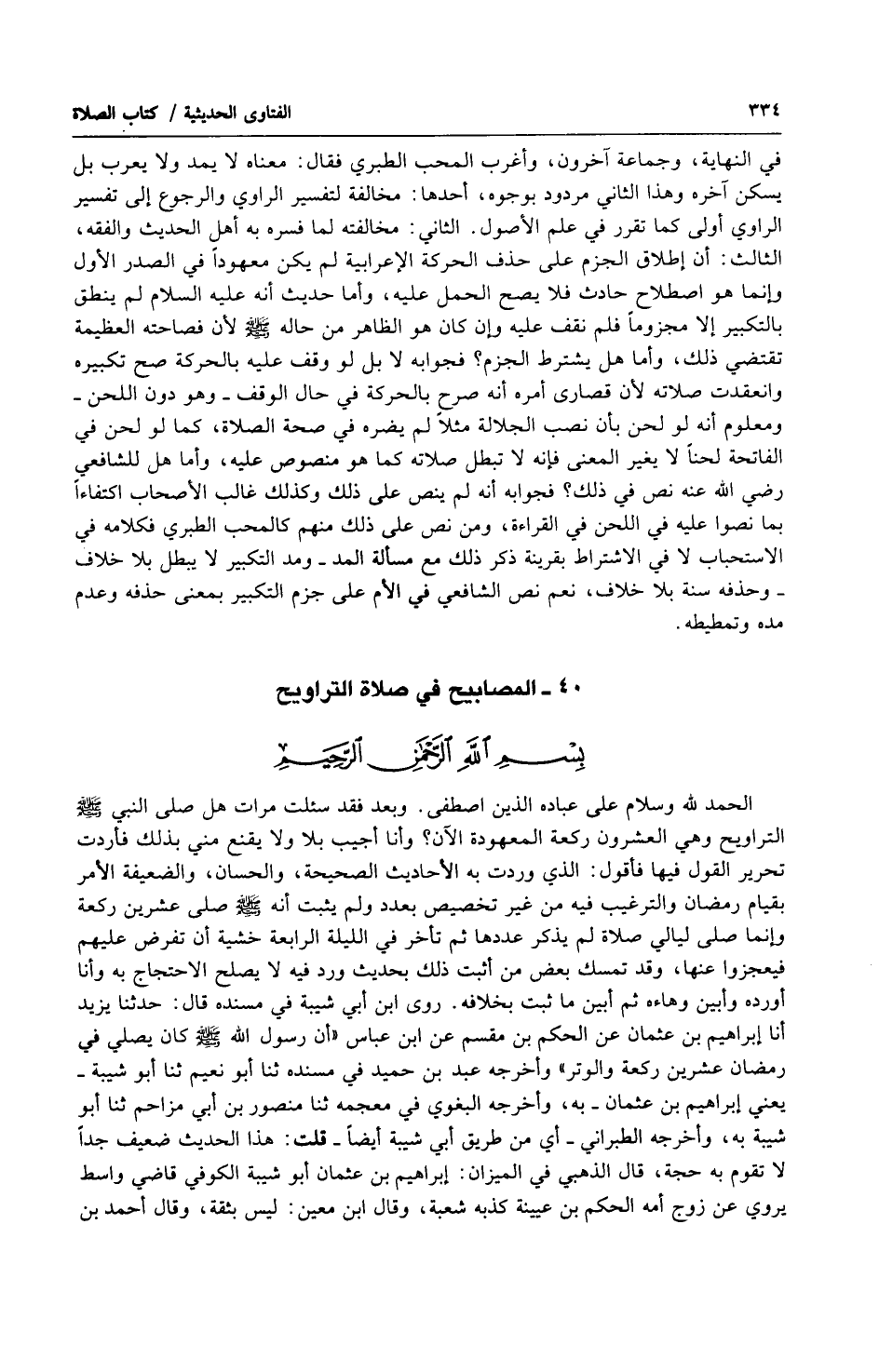 الحمدلله وسلام على عباده الذين اصطفى. وبعد فقد سئلت مرات هل صلى النبي صلى الله عليه وسلّم التراويح وهي العشرون ركعة المعهودة الآن؟ وأنا أجيب بلا ولا يقنع مني بذلك فأردت تحرير القول فيها فأقول: الذي وردت به الأحاديث الصحيحة، والحسان، والضعيفة الأمر بقيام رمضان والترغيب فيه من غير تخصيص بعدد ولم يثبت أنه صلى الله عليه وسلّم صلى عشرين ركعة وإنما صلى ليالي صلاة لم يذكر عددها ثم تأخر في الليلة الرابعة خشية أن تفرض عليهم فيعجزوا عنها، وقد تمسك بعض من أثبت ذلك بحديث ورد فيه لا يصلح الإحتجاج به وأنا أورده وأبين وهاءه ثم أبين ما ثبت بخلافه. روى ابن أبي شيبة في مسنده قال: حدثنا يزيد أنا إبراهيم بن عثمان عن الحكم بن مقسم عن ابن عباس (أن رسول الله صلى الله عليه وسلّم كان يصلي في رمضان عشرين ركعة والوتر) وأخرجه عبد بن حميد في مسنده ثنا أبو نعيم ثنا أبو شيبة يعني إبراهيم بن عثمان به، وأخرجه البغوي في معجمه ثنا منصور بن أبي مزاحم ثنا أبو شيبة به، وأخرجه الطبراني أي من طريق أبي شيبة أيضاً قلت: هذا الحديث ضعيف جداً لا تقوم به حجة، قال الذهبي في الميزان: إبراهيم بن عثمان أبو شيبة الكوفي قاضي واسط يروي عن زوج أمه الحكم بن عيينة كذبه شعبة، وقال ابن معين: ليس بثقة، وقال أحمد بن