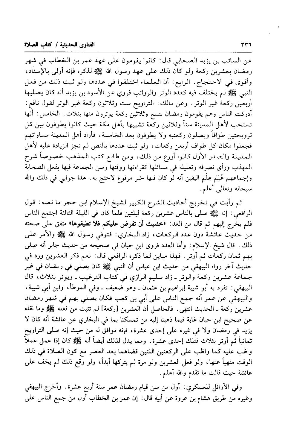 عن السائب بن يزيد الصحابي قال: كانوا يقومون على عهد عمر بن الخطاب في شهر رمضان بعشرين ركعة ولو كان ذلك على عهد رسول الله صلى الله عليه وسلّم لذكره فإنه أولى بالإسناد، وأقوى في الإحتجاج. الرابع: أن العلماء اختلفوا في عددها ولو ثبت ذلك من فعل النبي صلى الله عليه وسلّم لم يختلف فيه كعدد الوتر والرواتب فروي عن الأسود بن يزيد أنه كان يصليها أربعين ركعة غير الوتر. وعن مالك: التراويح ست وثلاثون ركعة غير الوتر لقول نافع: أدركت الناس وهم يقومون رمضان بتسع وثلاثين ركعة يوترون منها بثلاث. الخامس: أنها تستحب لأهل المدينة ستاً وثلاثين ركعة تشبيها بأهل مكة حيث كانوا يطوفون بين كل ترويحتين طوافاً ويصلون ركعتيه ولا يطوفون بعد الخامسة، فأراد أهل المدينة مساواتهم فجعلوا مكان كل طواف أربعن ركعات، ولو ثبت عددها بالنص لم تجز الزيادة عليه لأهل المدينة والصدر الأول كانوا أورع من ذلك، ومن طالع كتب المذهب خصوصاً شرح المهذب ورأى تصرفه وتعليله في مسائلها كقراءتها ووقتها وسن الجماعة فيها بفعل الصحابة وإجماعهم علم علم اليقين أنه لو كان فيها خبر مرفوع لاحتج به. هذا جوابي في ذلك والله سبحانه وتعالى أعلم.