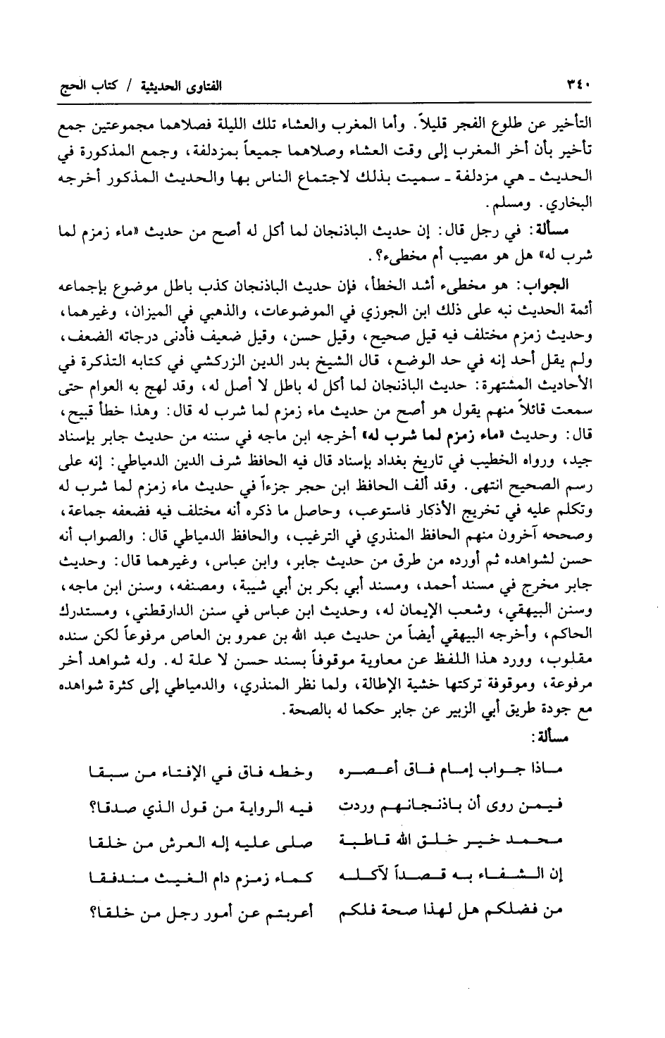 الجواب : هو مخطىء أشد الخطأ ، فإن حديث الباذنجان كذب باطل موضوع بإجماعه أئمة الحديث نبه على ذلك ابن الجوزي في الموضوعات ، والذهبي في الميزان ، وغيرهما ، وحديث زمزم مختلف فيه قيل صحيح ، وقيل حسن ، وقيل ضعيف فأدنى درجاته الضعف ، ولم يقل أحد إنه في حد الوضع ، قال الشيخ بدر الدين الزركشي في كتابه التذكرة في الأحاديث المشتهرة : حديث الباذنجان لما أكل له باطل لا أصل له ، وقد لهج به العوام حتى سمعت قائلاً منهم يقول هو أصح من حديث ماء زمزم لما شرب له قال : وهذا خطأ قبيح ، قال : وحديث ( ماء زمزم لما شرب له ) أخرجه ابن ماجه في سننه من حديث جابر بإسناد جيد ، ورواه الخطيب في تاريخ بغداد بإسناد قال فيه الحافظ شرف الدين الدمياطي : إنه على رسم الصحيح انتهى. وقد ألف الحافظ ابن حجر جزءاً في حديث ماء زمزم لما شرب له وتكلم عليه في تخريج الأذكار فاستوعب ، وحاصل ما ذكره أنه مختلف فيه فضعفه جماعة ، وصححه آخرون منهم الحافظ المنذري في الترغيب ، والحافظ الدمياطي قال : والصواب أنه حسن لشواهده ثم أورده من طرق من حديث جابر ، وابن عباس ، وغيرهما قال : وحديث جابر مخرج في مسند أحمد ، ومسند أبي بكر بن أبي شيبة ، ومصنفه ، وسنن ابن ماجه ، وسنن البيهقي ، وشعب الإيمان له ، وحديث ابن عباس في سنن الدارقطني ، ومستدرك الحاكم ، وأخرجه البيهقي أيضاً من حديث عبد الله بن عمرو بن العاص مرفوعاً لكن سنده مقلوب ، وورد هذا اللفظ عن معاوية موقوفاً بسند حسن لا علة له. وله شواهد أخر مرفوعة ، وموقوفة تركتها خشية الإطالة ، ولما نظر المنذري ، والدمياطي إلى كثرة شواهده مع جودة طريق أبي الزبير عن جابر حكما له بالصحة.