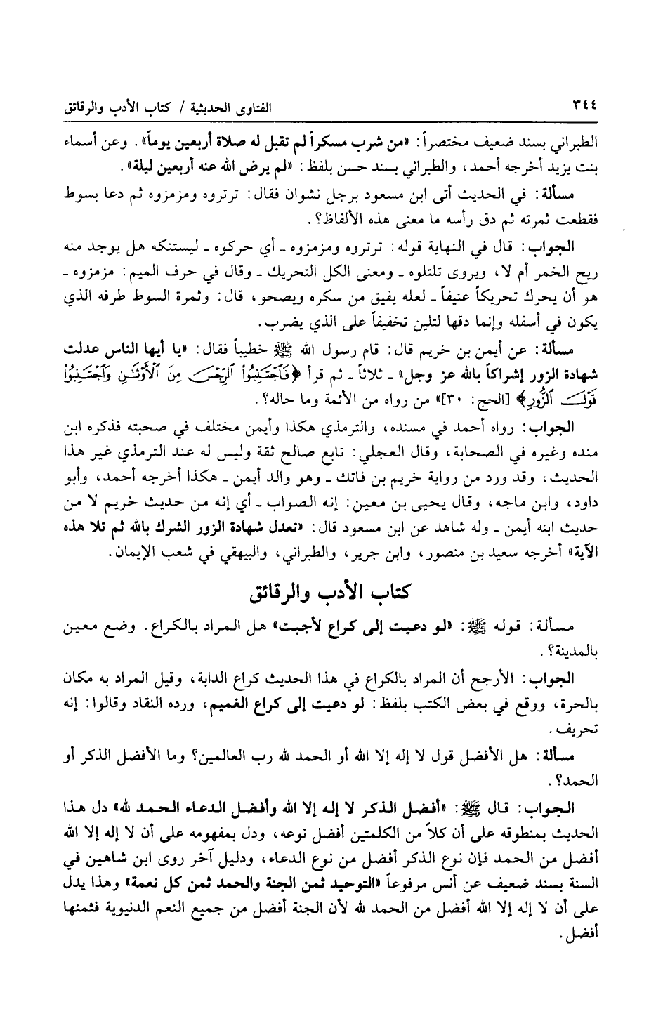 الجواب: رواه أحمد في مسنده، م والترمذي هكذا وأيمن مختلف في صحبته فذكره ابن منده وغيره في الصحابة، وقال العجلي: تابع صالح ثقة وليس له عند الترمذي غير هذا الحديث، وقد ورد من رواية خريم بن فاتك وهو والد أيمن هكذا أخرجه أحمد، وأبو داود، وابن ماجه، وقال يحيى بن معين: إنه الصواب أي إنه من حديث خريم لا من حديث ابنه أيمن وله شاهد عن ابن مسعود قال: (تعدل شهادة الزور الشرك بالله ثم تلا هذه الآية) أخرجه سعيد بن منصور، وابن جرير، والطبراني، والبيهقي في شعب الإيمان.
