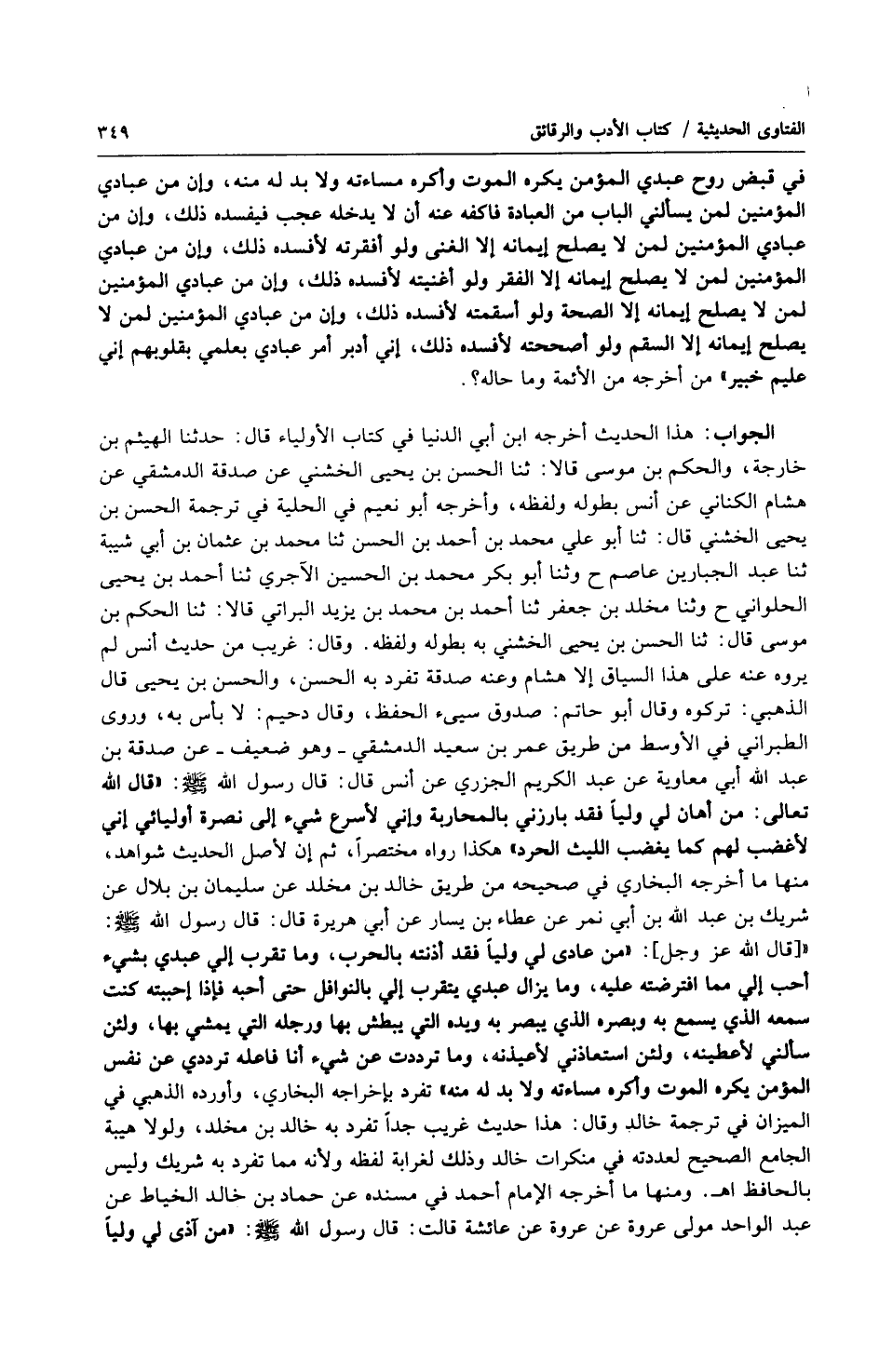 الجواب: هذا الحديث أخرجه ابن أبي الدنيا في كتاب الأولياء قال: حدثنا الهيثم بن خارجة، والحكم بن موسى قالا: ثنا الحسن بن يحيى الخشني عن صدقة الدمشقي عن هشام الكناني عن أنس بطوله ولفظه، وأخرجه أبو نعيم في الحلية في ترجمة الحسن بن يحيى الخشني قال: ثنا أبو علي محمد بن أحمد بن الحسن ثنا محمد بن عثمان بن أبي شيبة ثنا عبد الجبارين عاصم ح وثنا أبو بكر محمد بن الحسين الآجري ثنا أحمد بن يحيى الحلواني ح وثنا مخلد بن جعفر ثنا أحمد ابن محمد بن يزيد البراتي قالا: ثنا الحكم بن موسى قال: ثنا الحسن بن يحيى الخشني به بطوله ولفظه. وقال: غريب من حديث أنس لم يروه عنه على هذا السياق إلا هشام وعنه صدقة تفرد به الحسن، والحسن بن يحيى قال الذهبي: تركوه وقال أبو حاتم: صدوق سيء الحفظ، وقال دحيم: لا بأس به، وروى الطبراني في الأوسط من طريق عمر بن سعيد الدمشقي وهو ضعيف عن صدقة بن عبد الله أبي معاوية عن عبد الكريم الجزري عن أنس قال: قال رسول الله صلى الله عليه وسلّم: (قال الله تعالى: من أهان لي ولياً فقد بارزني بالمحاربة وإني لأسرع شيء إلى نصرة أوليائي إني لأغضب لهم كما يغضب الليث الحرد) هكذا رواه مختصراً، ثم إن لأصل الحديث شواهد، منها ما أخرجه البخاري في صحيحه من طريق خالد بن مخلد عن سليمان بن بلال عن شريك بن عبد الله بن أبي نمر عن عطاء بن يسار عن أبي هريرة قال: قال رسول الله صلى الله عليه وسلّم: ([قال الله عز وجل]: (من عادى لي ولياً فقد أذنته بالحرب، وما تقرب إلى عبدي بشيء أحب إلي مما افترضته عليه، وما يزال عبدي يتقرب إلي بالنوافل حتى أحبه فإذا إحببته كنت سمعه الذي يسمع به وبصره الذي يبصر به ويده التي يبطش بها ورجله التي يمشي بها، ولئن سألني لأعطينه، ولئن استعاذني لأعيذنه، وما ترددت عن شيء أنا فاعله ترددي عن نفس المؤمن يكره الموت وأكره مساءته ولا بد له منه) تفرد بإخراجه البخاري، وأورده الذهبي في الميزان في ترجمة خالد وقال: هذا حديث غريب جداً تفرد به خالد بن مخلد، ولولا هيبة الجامع الصحيح لعددته في منكرات خالد وذلك لغرابة لفظه ولأنه مما تفرد به شريك وليس بالحافظ اه. ومنها ما أخرجه الإمام أحمد في مسنده عن حماد بن خالد الخياط عن عبد الواحد مولى عروة عن عروة عن عائشة قالت: قال رسول الله صلى الله عليه وسلّم: (من آذى لي ولياً
