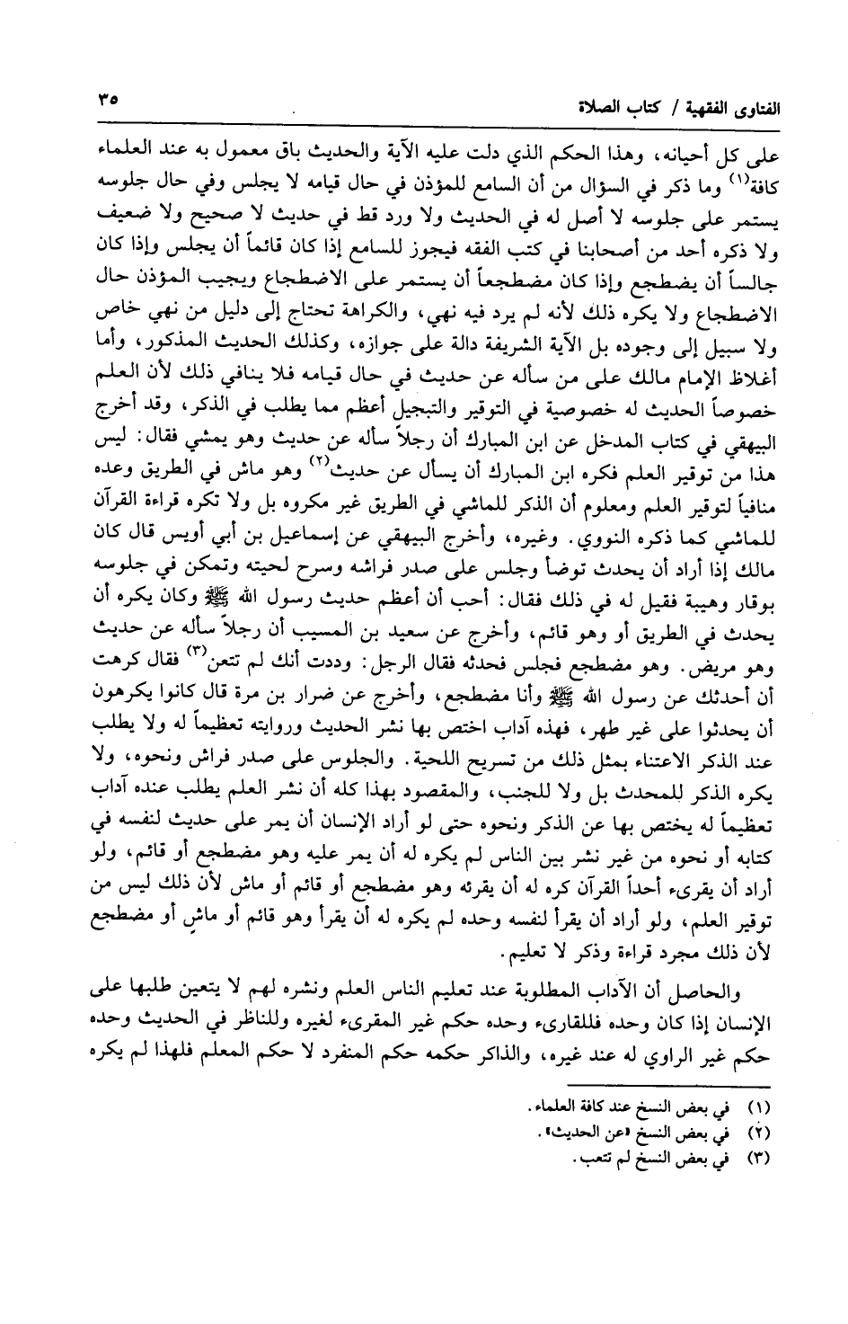 على كل أحيانه، وهذا الحكم الذي دلت عليه الآية والحديث باق معمول به عند العلماء كافة وما ذكر في السؤال من أن السامع للمؤذن في حال قيامه لا يجلس وفي حال جلوسه يستمر على جلوسه لا أصل له في الحديث ولا ورد قط في حديث لا صحيح ولا ضعيف، ولا ذكره أحد من أصحابنا في كتب الفقه، فيجوز للسامع إذا كان قائماً أن يجلس وإذا كان جالساً أن يضطجع وإذا كان مضطجعاً أن يستمر على الاضطجاع ويجيب المؤذن حال الاضطجاع ولا يكره ذلك لأنه لم يرد فيه نهي، والكراهة تحتاج إلى دليل من نهي خاص ولا سبيل إلى وجوده بل الآية الشريفة دالة على جوازه، وكذلك الحديث المذكور، وأما إغلاظ الإمام مالك على من سأله عن حديث في حال قيامه فلا ينافي ذلك لأن العلم خصوصاً الحديث له خصوصية في التوقير والتبجيل أعظم مما يطلب في الذكر، وقد أخرج البيهقي في كتاب المدخل عن ابن المبارك أن رجلاً سأله عن حديث وهو يمشي فقال: ليس هذا من توقير العلم فكره ابن المبارك أن يسأل عن حديث وهو ماش في الطريق وعده منافياً لتوقير العلم، ومعلوم أن الذكر للماشي في الطريق غير مكروه بل ولا تكره قراءة القرآن للماشي كما ذكره النووي، وغيره، وأخرج البيهقي عن إسماعيل بن أبي أويس قال: كان مالك إذا أراد أن يحدث توضأ وجلس على صدر فراشه وسرح لحيته وتمكن في جلوسه بوقار وهيبة فقيل له في ذلك فقال: أحب أن أعظم حديث رسول الله صلى الله عليه وسلّم وكان يكره أن يحدث في الطريق أو وهو قائم، وأخرج عن سعيد بن المسيب أن رجلاً سأله عن حديث وهو مريض، وهو مضطجع فجلس فحدثه فقال الرجل: وددت أنك لم تتعن فقال: كرهت أن أحدثك عن رسول الله صلى الله عليه وسلّم وأنا مضطجع، وأخرج عن ضرار بن مرة قال: كانوا يكرهون أن يحدثوا على غير طهر، فهذه آداب اختص بها نشر الحديث وروايته تعظيماً له، ولا يطلب عند الذكر الاعتناء بمثل ذلك من تسريح اللحية، والجلوس على صدر فراش ونحوه، ولا يكره الذكر للمحدث بل ولا للجنب، والمقصود بهذا كله أن نشر العلم يطلب عنده آداب تعظيماً له يختص بها عن الذكر ونحوه، حتى لو أراد الإنسان أن يمر على حديث لنفسه في كتابه أو نحوه من غير نشر بين الناس لم يكره له أن يمر عليه وهو مضطجع أو قائم، ولو أراد أن يقرىء أحداً القرآن كره له أن يقرئه وهو مضطجع أو قائم أو ماش لأن ذلك ليس من توقير العلم، ولو أراد أن يقرأ لنفسه وحده لم يكره له أن يقرأ وهو قائم أو ماش أو مضطجع لأن ذلك مجرد قراءة وذكر لا تعليم.