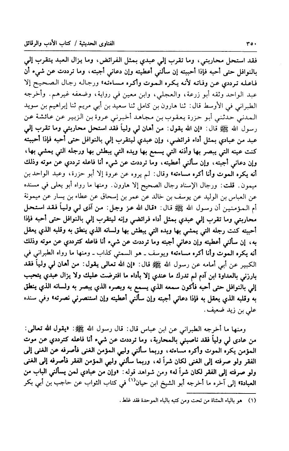 فقد استحل محاربتي، وما تقرب إلي عبدي بمثل الفرائض، وما يزال العبد يتقرب إلي بالنوافل حتى أحبه فإذا أحببته إن سألني أعطيته وإن دعاني أجبته، وما ترددت عن شيء أن فاعله ترددي عن وفاته لأنه يكره الموت وأكره مساءته) ورجاله رجال الصحيح إلا عبد الواحد وثقة أبو زرعة، والعجلي، وابن معين في رواية، وضعفه غيرهم. وأخرجه الطبراني في الأوسط قال: ثنا هرون ابن كامل ثنا سعيد بن أبي مريم ثنا إبراهيم بن سويد المدني حدثني أبو حزرة يعقوب بن مجاهد أخبرني عروة بن الزبير عن عائشة عن رسول الله صلى الله عليه وسلّم قال: (إن الله يقول: من أهان لي ولياً فقد استحل محاربتي وما تقرب إلي عبد من عبادي بمثل أداء فرائضي، وإن عبدي ليتقرب إلي بالنوافل حتى أحبه فإذا أحببته كنت عينه التي يبصر بها وأذنه التي يسمع بها ويده التي يبطش بها ورجله التي يمشي بها، وإن دعاني أجبته، وإن سألني أعطيته، وما ترددت عن شيء أنا فاعله ترددي عن موته وذلك أنه يكره الموت وأنا أكره مساءته) وقال: لم يروه عن عروة إلا أبو حزرة، وعبد الواحد بن ميمون. قلت: ورجال الإسناد رجال الصحيح إلا هرون. ومنها ما رواه أبو يعلى في مسنده عن العباس بن الوليد عن يوسف بن خالد عن عمر بن إسحاق عن عطاء بن يسار عن ميمونة أم المؤمنين أن رسول الله صلى الله عليه وسلّم قال: (فإن الله عز وجل: من آذى لي ولياً فقد استحل محاربتي وما تقرب إلي عبدي بمثل أداء فرائضي وأنه ليتقرب إلي بالنوافل حتى أحبه فإذا أحببته كنت رجله التي يمشي بها ويده التي يبطش بها ولسانه الذي ينطق به وقلبه الذي يعقل به، إن سألني أعطيته وإن دعاني أجبته وما ترددت عن شيء أنا فاعله كترددي عن موته وذلك أنه يكره الموت وأنا أكره مساءته) ويوسف هو السمتي كذاب ومنها ما رواه الطبراني في الكبير عن أبي أمامه عن رسول الله صلى الله عليه وسلّم قال: (إن الله تعالى يقول: من أهان لي ولياً فقد بارزني بالعداوة ابن آدم لم تدرك ما عندي إلا بأداء ما افترضت عليك ولا يزال عبدي يتحبب إلي بالنوافل حتى أحبه فأكون سمعه الذي يسمع به وبصره الذي يبصر به ولسانه الذي ينطق به وقلبه الذي يعقل به فإذا دعاني أجبته وإن سألني أعطيته وإن استنصرني نصرته) وفي سنده علي بن زيد ضعيف.