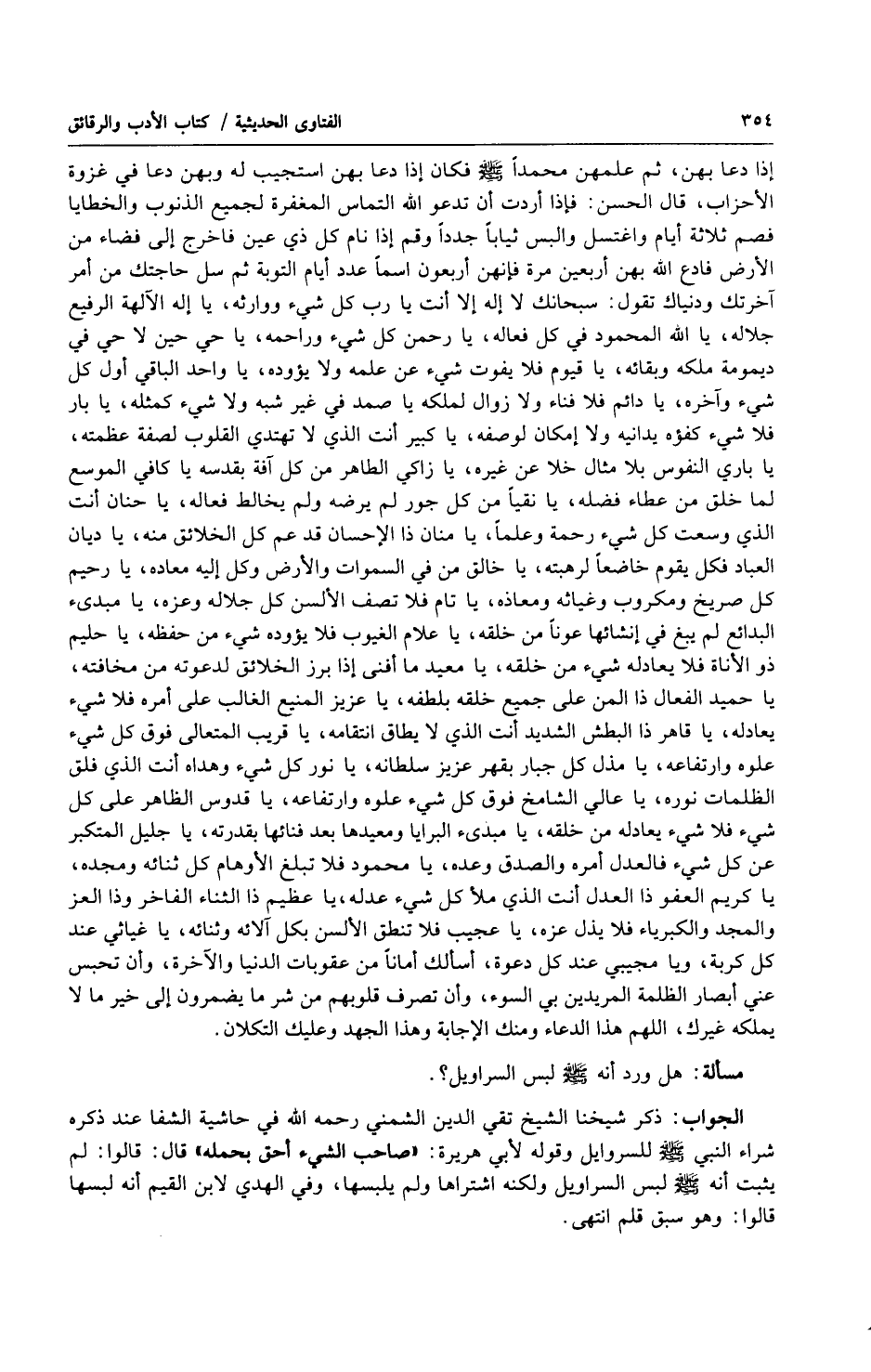 الجواب : ذكر شيخنا الشيخ تقي الدين الشمني رحمه الله في حاشية الشفا عند ذكره شراء النبي صلى الله عليه وسلّم للسروايل وقوله لأبي هريرة : ( صاحب الشيء أحق بحمله ) قال : قالوا : لم يثبت أنه صلى الله عليه وسلّم لبس السراويل ولكنه اشتراها ولم يلبسها ، وفي الهدى لابن القيم أنه لبسها قالوا : وهو سبق قلم انتهى.