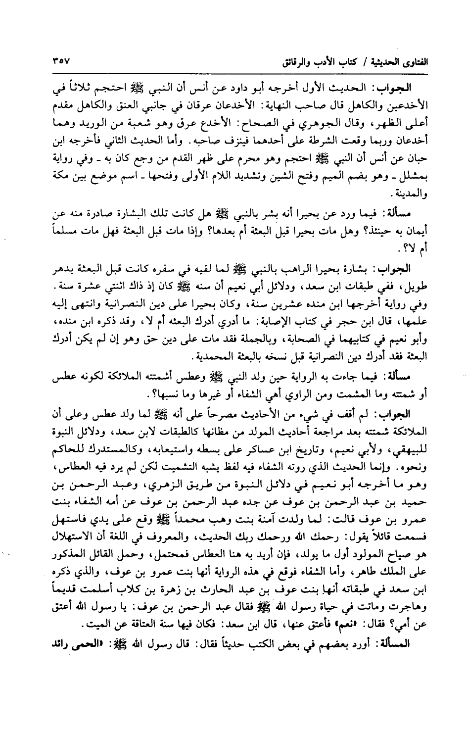 مسألة: فيما جاءت به الرواية حين ولد النبي صلى الله عليه وسلّم وعطس أشمتته الملائكة لكونه عطس أو شمتته وما المشمت ومن الراوي أهي الشفاء أو غيرها وما نسبها؟.