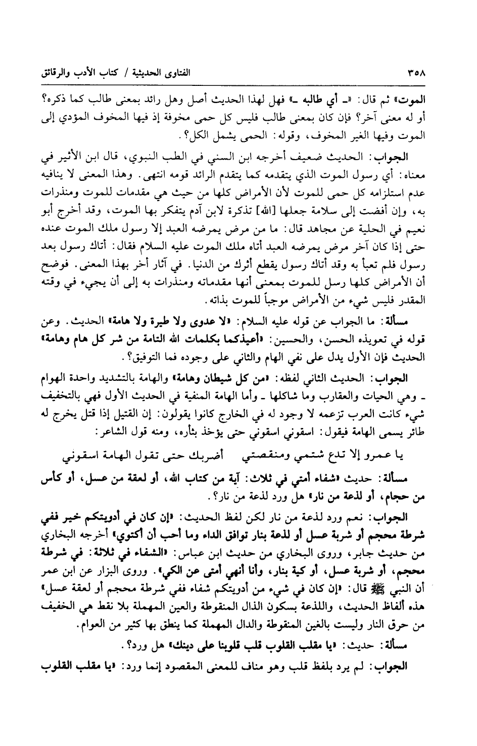 الجواب: الحديث ضعيف أخرجه ابن السني في الطب النبوي، قال ابن الأثير في معناه: أي رسول الموت الذي يتقدمه كما يتقدم الرائد قومه انتهى. وهذا المعنى لا ينافيه عدم استلزامه كل حمى للموت لأن الأمراض كلها من حيث هي مقدمات للموت ومنذرات به، وإن أفضت إلى سلامة جعلها [الله] تذكرة لابن آدم يتفكر بها الموت، وقد أخرج أبو نعيم في الحلية عن مجاهد قال: ما من مرض يمرضه العبد إلا رسول ملك الموت عنده حتى إذا كان آخر مرض يمرضه العبد أتاه ملك الموت عليه السلام فقال: أتاك رسول بعد رسول فلم تعبأ به وقد أتاك رسول يقطع أثرك من الدنيا. في آثار أخر بهذا المعنى. فوضح أن الأمراض كلها رسل للموت بمعنى أنها مقدماته ومنذرات به إلى أن يجيء في وقته المقدر فليس شيء من الأمراض موجباً للموت بذاته.
