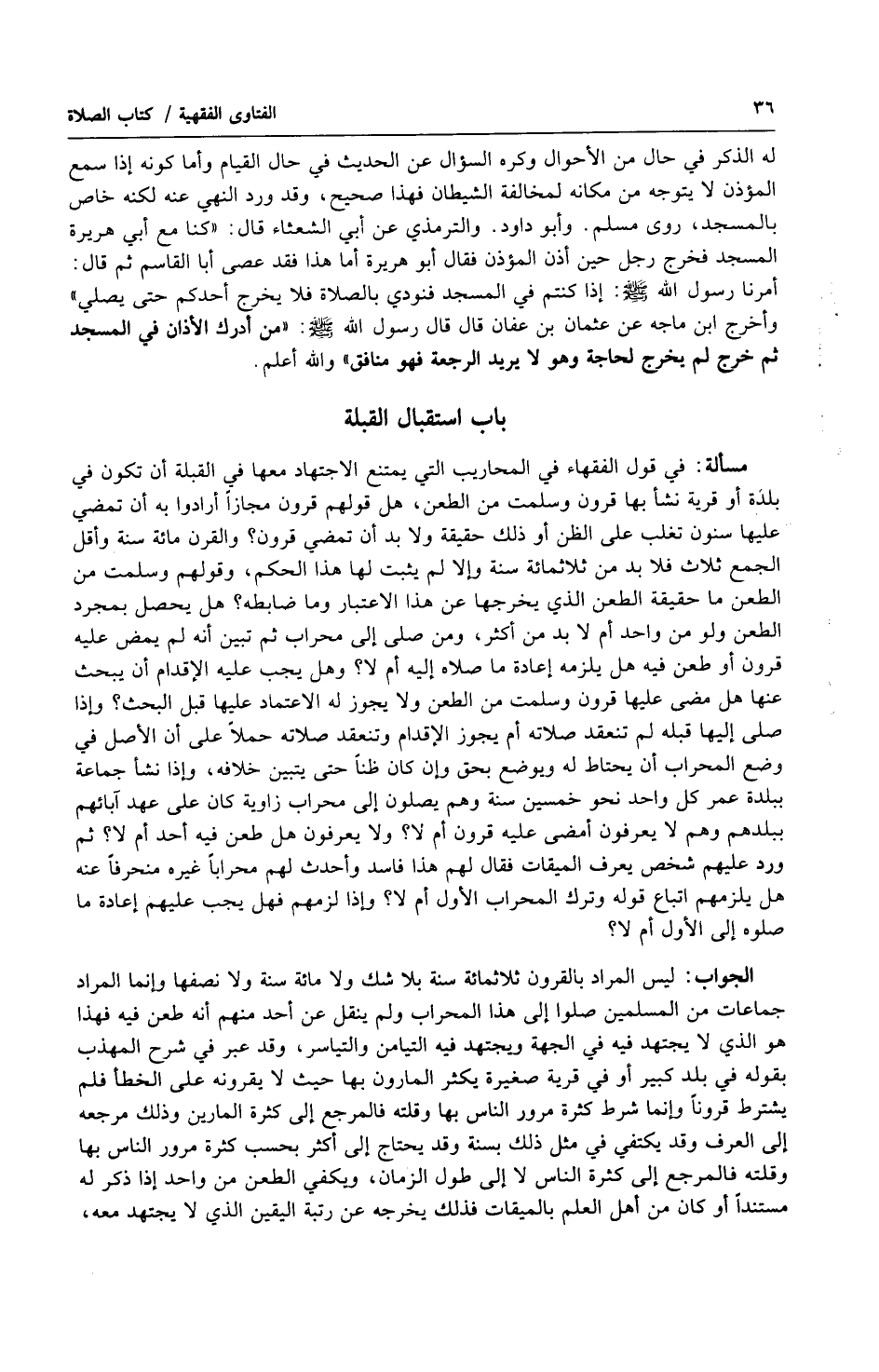 الجواب: ليس المراد بالقرون ثلثمائة سنة بلا شك ولا مائة سنة ولا نصفها، وإنما المراد جماعات من المسلمين صلوا إلى هذا المحراب ولم ينقل عن أحد منهم أنه طعن فيه، فهذا هو الذي لا يجتهد فيه في الجهة ويجتهد فيه في التيامن والتياسر، وقد عبر في شرح المهذب بقوله في بلد كبير أو في قرية صغيرة يكثر المارون بها حيث لا يقرونه على الخطأ فلم يشترط قروناً وإنما شرط كثرة المارين وذلك مرجعه إلى العرف، وقد يكتفي في مثل ذلك بسنة، وقد يحتاج إلى أكثر بحسب كثرة مرور الناس بها وقلته فالمرجع إلى كثرة الناس لا إلى طول الزمان، ويكفي الطعن من واحد إذا ذكر له مستنداً أو كان من أهل العلم بالميقات فذلك يخرجه عن رتبة اليقين الذي لا يجتهد معه،