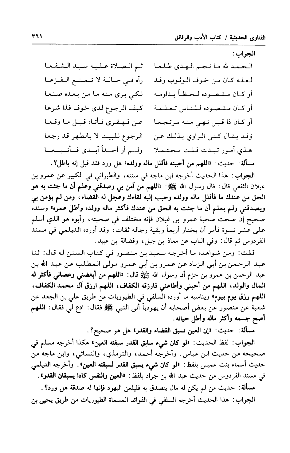 الجواب: هذا الحديث أخرجه ابن ماجه في سننه، والطبراني في الكبير عن عمرو ابن غيلان الثقفي قال: قال رسول الله صلى الله عليه وسلّم: (اللهم من آمن بي وصدقني وعلم أن ما جئت به هو الحق من عندك ما فأقلل ماله وولده وحبب إليه لقاءك وعجل له القضاء، ومن لم يؤمن بي ويصدقني ولم يعلم أن ما جئت به الحق من عندك فأكثر ماله وولده وأطل عمره) وسنده صحيح إن صحت صحبة عمرو بن غيلان فإنه مختلف في صحبته، وأبوه هو الذي أسلم على عشر نسوة فأمر أن يختار أربعاً وبقية رجاله ثقات، وقد أورده الديلمي في مسند الفردوس ثم قال: وفي الباب عن معاذ بن جبل، وفضالة بن عبيد.