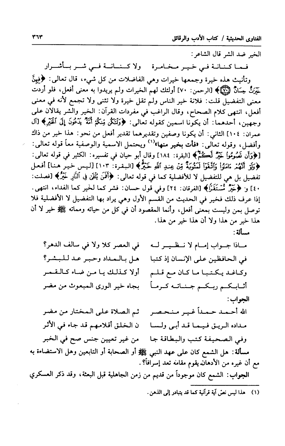 وتأنيث هذه خيرة وجمعها خيرات وهي الفاضلات من كل شيء ، قال تعالى : ) فيهن خيرات حسان ( أولئك لهم الخيرات ولم يريدوا به معنى أفعل ، فلو أردت معنى التفضيل قلت : فلانة خير الناس ولم تقل خيرة ولا تثنى ولا تجمع لأنه في معنى أفعل ، انتهى كلام الصحاح ، وقال الراغب في مفردات القرآن : الخير والشر يقالان على وجهين ، أحدهما : أن يكونا اسمين كقوله تعالى : ) ولتكن منكم أمة يدعون إلى الخير ( الثاني : أن يكونا وصفين وتقديرهما تقدير أفعل من نحو : هذا خير من ذاك وأفضل ، وقوله تعالى : ) فأت بخير منها ( ويحتمل الاسمية والوصفية معاً قوله تعالى : ) وأن تصوموا خير لكم ( وقال أبو حيان في تفسيره : الكثير في قوله تعالى : ] ) ولو أنهم آمنوا واتقوا لمثوبة من عند الله خير ( [ ليس خير هنا ] أفعل تفضيل بل هي للتفضيل لا للأفضلية كما في قوله تعالى : ) أفمن يلقى في النار خير ( و ) خير مستقرا ( وفي قول حسان : فشر كما لخير كما الفداء ، انتهى. إذا عرف ذلك فخير في الحديث من القسم الأول وهي يراد بها التفضيل لا الأفضلية فلا توصل بمن وليست بمعنى أفعل ، وأنما المقصود أن في كل من حياته ومماته صلى الله عليه وسلّم خير لا أن هذا خير من هذا ولا أن هذا خير من هذا.