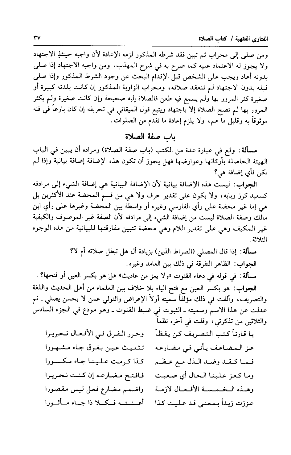 الجواب: ليست هذه الإضافة بيانية لأن الإضافة البيانية هي إضافة الشيء إلى مرادفه كسعيد كرز وبابه، ولا يكون على تقدير حرف ولا هي من قسم المحضة عند الأكثرين، بل هي إما غير محضة على رأي الفارسي وغيره أو واسطة بين المحضة وغيرها على رأي ابن مالك، وصفة الصلاة ليست من إضافة الشيء إلى مرادفه لأن الصفة غير الموصوف والكيفية غير المكيف وهي على تقدير اللام وهي محضة تتبين مفارقتها للبيانية من هذه الوجوه الثلاثة.