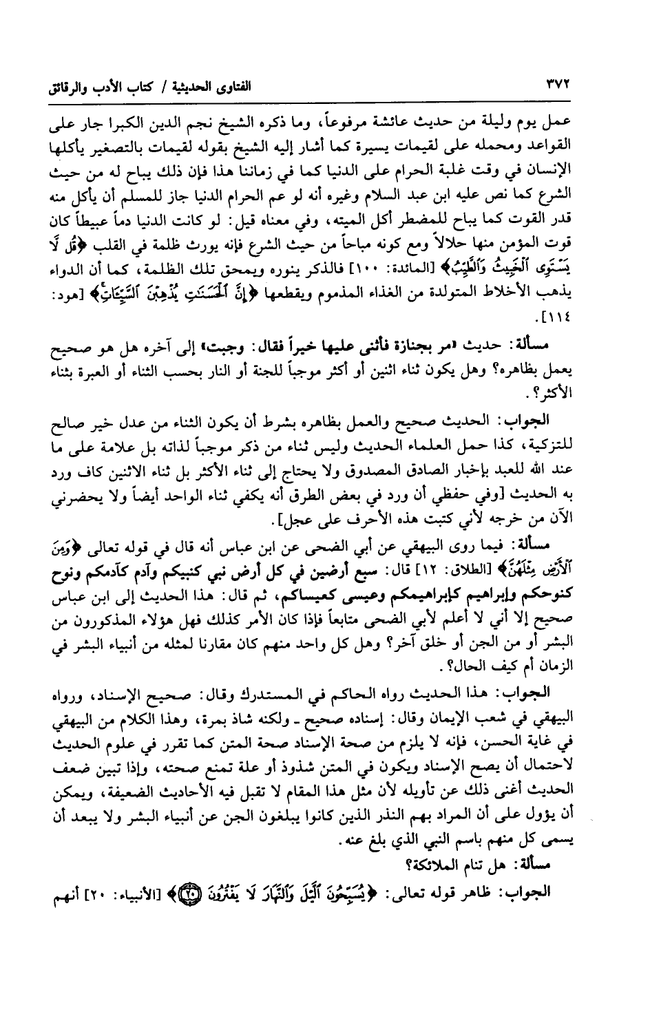 عمل يوم وليلة من حديث عائشة مرفوعاً ، وماذكره الشيخ نجم الدين الكبرا جار على القواعد ومحمله على لقيمات يسيرة كما أشار إليه الشيخ بقوله لقيمات بالتصغير يأكلها الإنسان في وقت غلبة الحرام على الدنيا كما في زماننا هذا فإن ذلك يباح له من حيث الشرع كما نص عليه ابن عبد السلام وغيره أنه لوعم الحرام الدنيا جاز للمسلم أن يأكل منه قدر القوت كما يباح للمضطر أكل الميته ، وفي معناه قيل : لو كانت الدنيا دماً عبيطاً كان قوت المؤمن منها حلالاً ومع كونه مباحاً من حيث الشرع فإنه يورث ظلمة في القلب ) قل لا يستوي الخبيث والطيب ( فالذكر ينوره ويمحق تلك الظلمة ، كما أن الدواء يذهب الأخلاط المتولدة من الغذاء المذموم ويقطعها ) إن الحسنات يذهبن السيئات (.