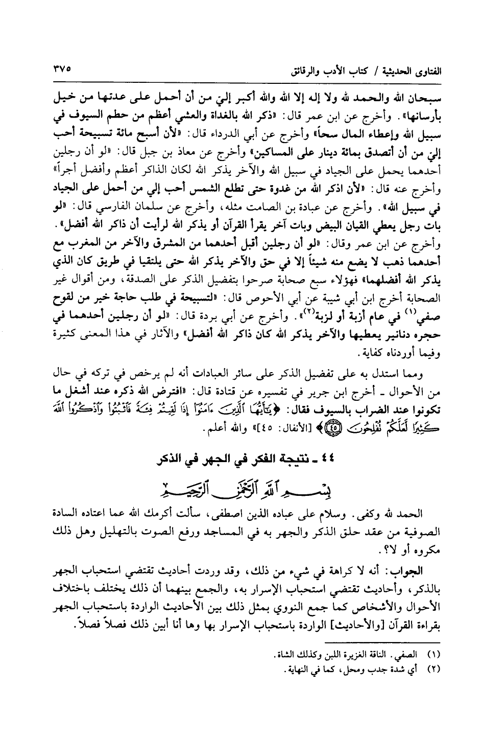 الجواب: أنه لا كراهة في شيء من ذلك، وقد وردت أحاديث تقتضي استحباب الجهر بالذكر، وأحاديث تقتضي استحباب الإسرار به، والجمع بينهما أن ذلك يختلف باختلاف الأحوال والأشخاص كما جمع النووي بمثل ذلك بين الأحاديث الواردة باستحباب الجهر بقراءة القرآن [والأحاديث] الواردة باستحباب الإسرار بها وها أنا أبين ذلك فصلاً فصلاً.