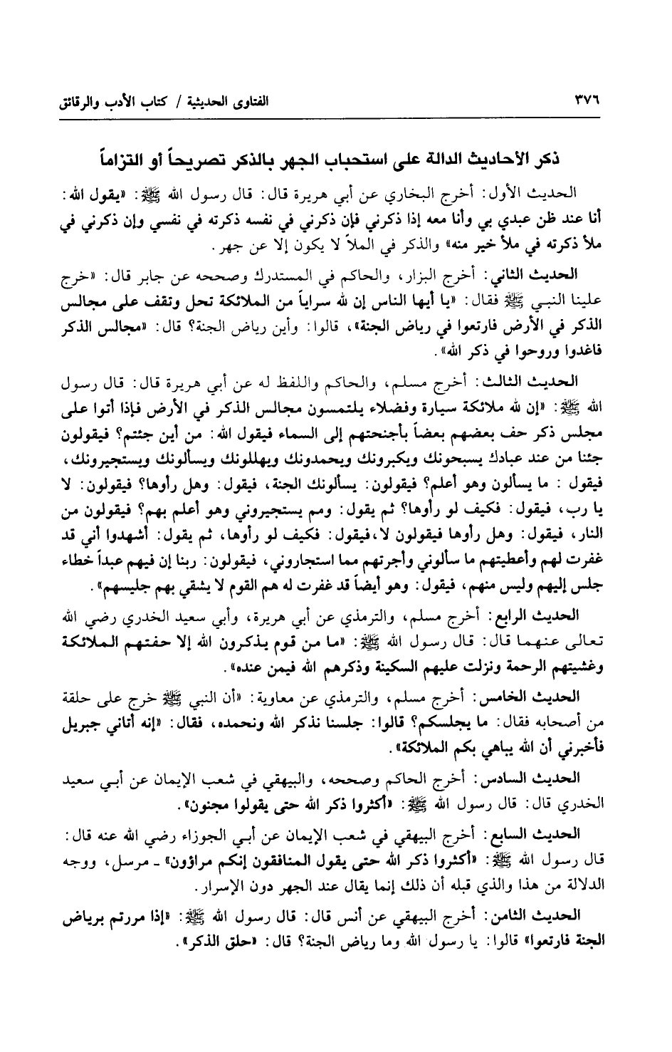 الحديث الثامن: أخرج البيهقي عن أنس قال: قال رسول الله صلى الله عليه وسلّم: (إذا مررتم برياض الجنة فارتعوا) قالوا: يا رسول الله وما رياض الجنة؟ قال: (حلق الذكر).