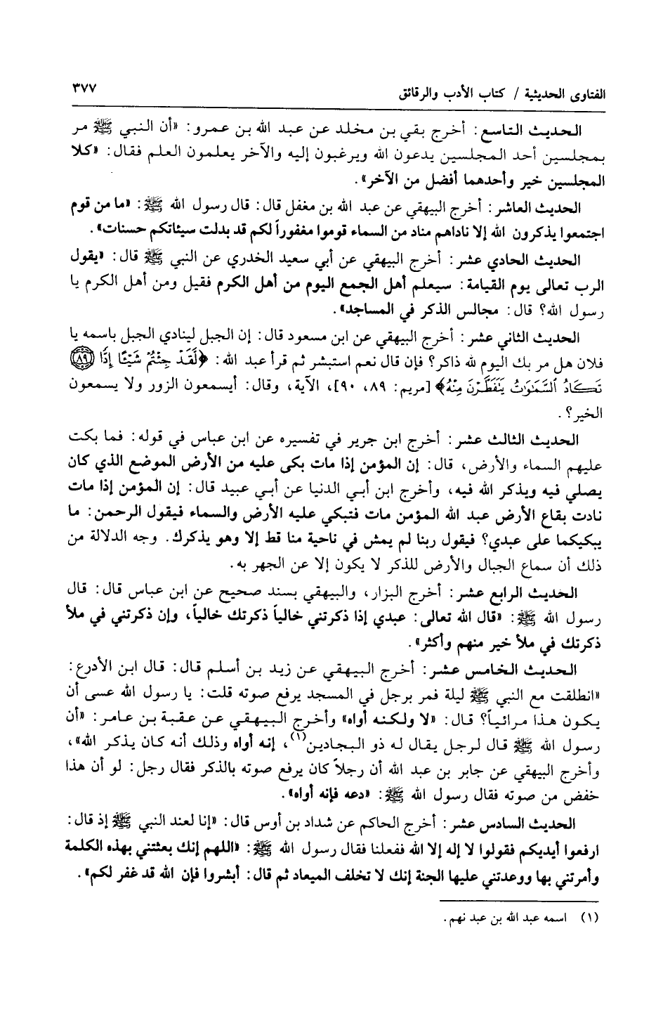 الحديث الخامس عشر : أخرج البيهقي عن زيد بن أسلم قال : قال ابن الأدرع : ( انطلقت مع النبي صلى الله عليه وسلّم ليلة فمر برجل في المسجد يرفع صوته قلت : يا رسول الله عسى أن يكون هذا مرائياً ؟ قال : ( لا ولكنه أواه ) وأخرج البيهقي عن عقبة بن عامر : ( أن رسول الله صلى الله عليه وسلّم قال لرجل يقال له ذو البجادين ، إنه أواه وذلك أنه كان يذكر الله ) ، وأخرج البيهقي عن جابر بن عبد الله أن رجلاً كان يرفع صوته بالذكر فقال رجل : لو أن هذا خفض من صوته فقال رسول الله صلى الله عليه وسلّم : ( دعه فإنه أواه ).